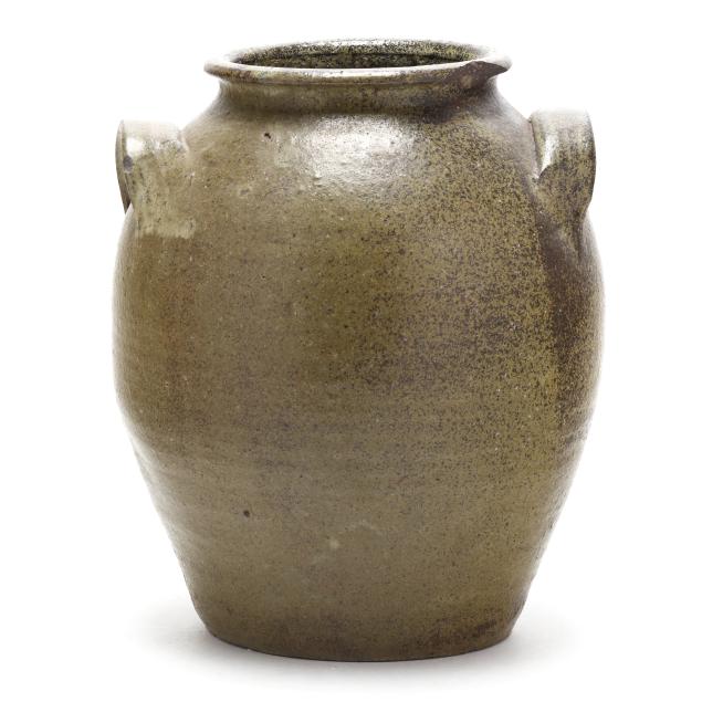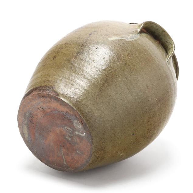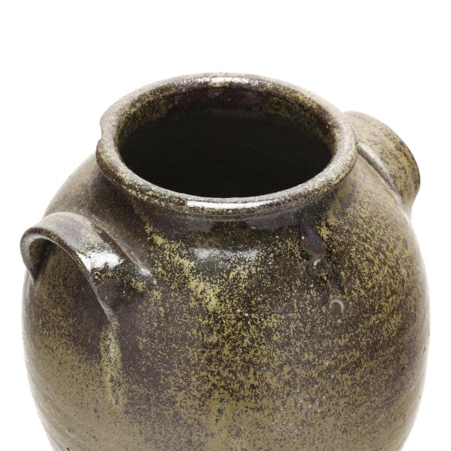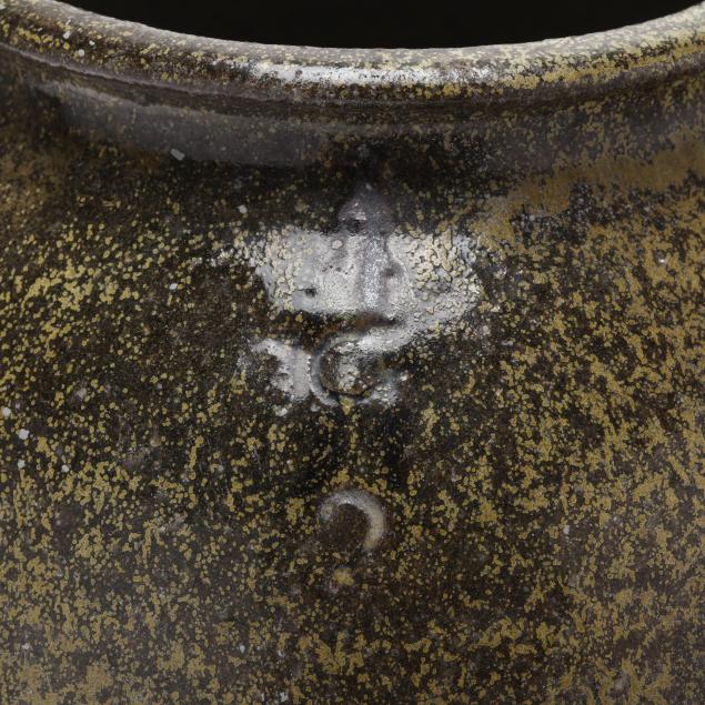 Circa 1870s, signed "JG" above a "2" capacity mark, of ovoid form with dual lug handles, featuring an alkaline glaze with allover golden tone rutile surface.