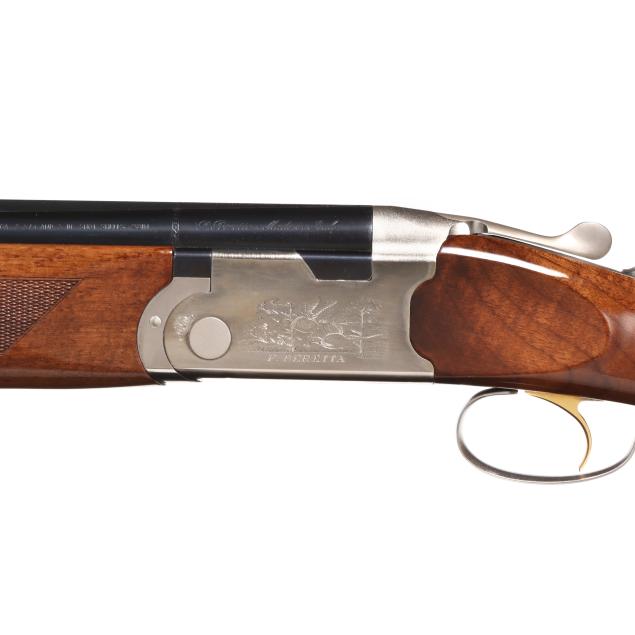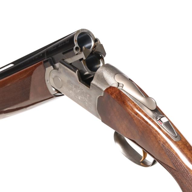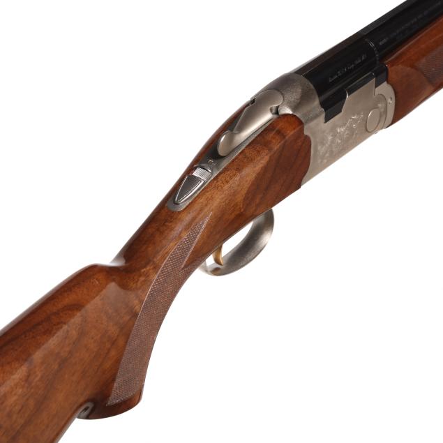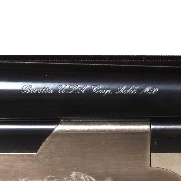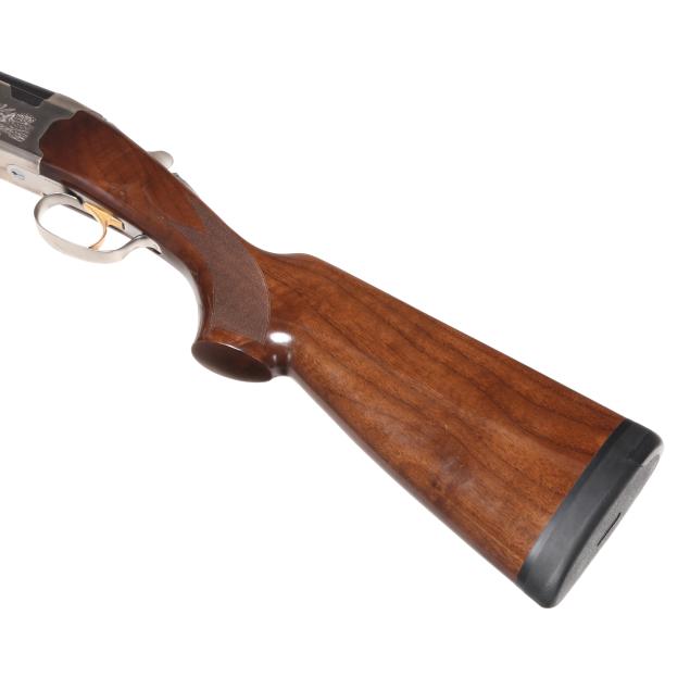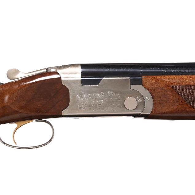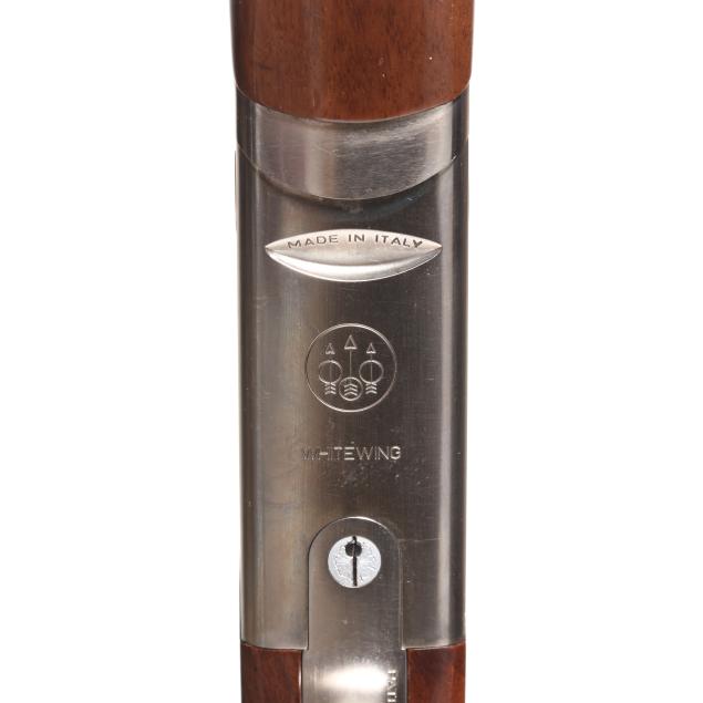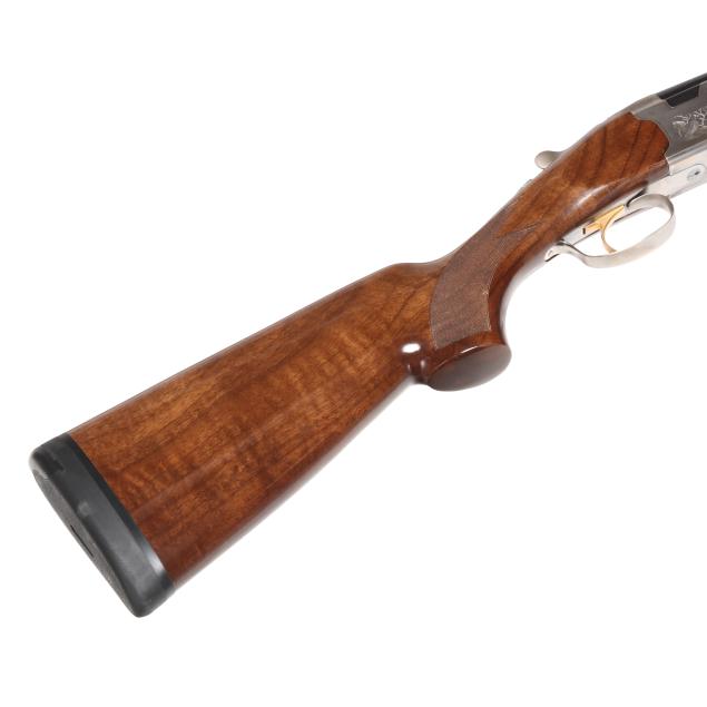 Serial number N638698 present under top tang of over/under action receiver, engraved pheasants in flight scene on right side of receiver, engraved quail in flight on right side of receiver, model WHITEWING engraved on belly of receiver, single selective trigger, ejectors, automatic safety, text of 12GA 2 3/4 AND 3 IN. SHOT SHELLS - 28 IN. present on 28 in. blued vent rib barrel with single bead, high gloss checkered pistol grip walnut stock with PACHMAYR DECELERATOR recoil pad, high gloss checkered walnut stock.