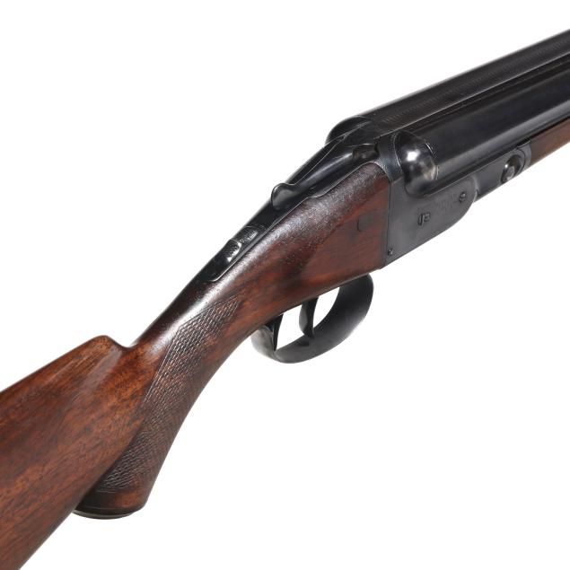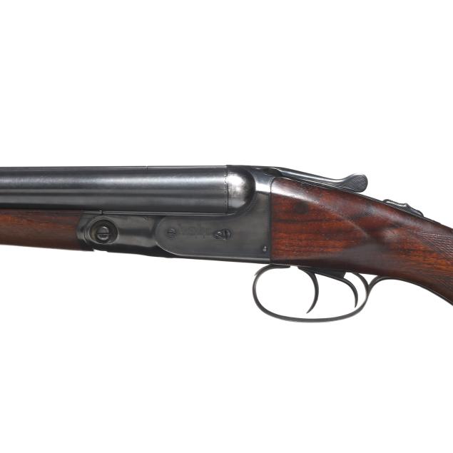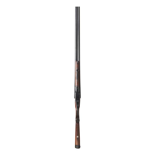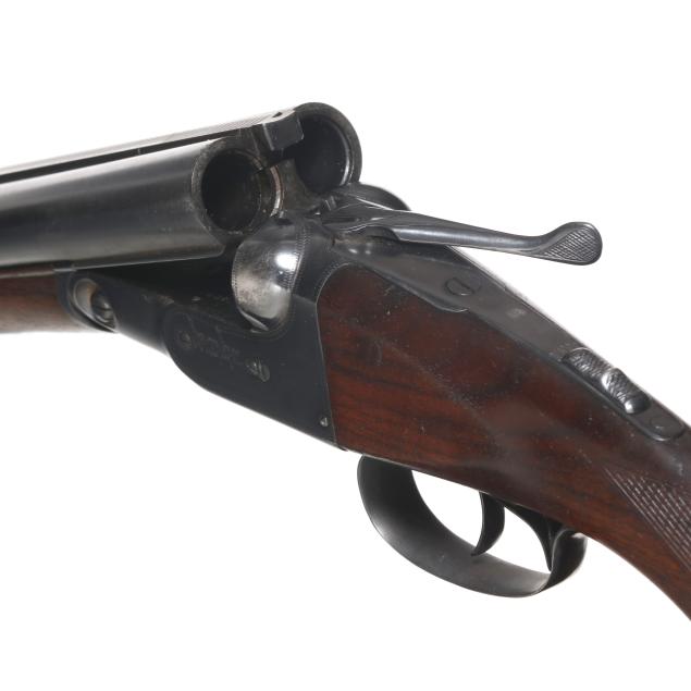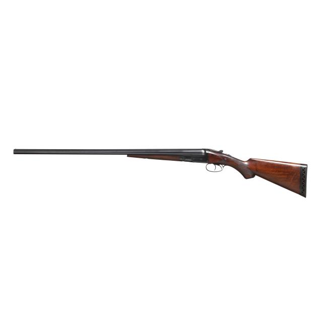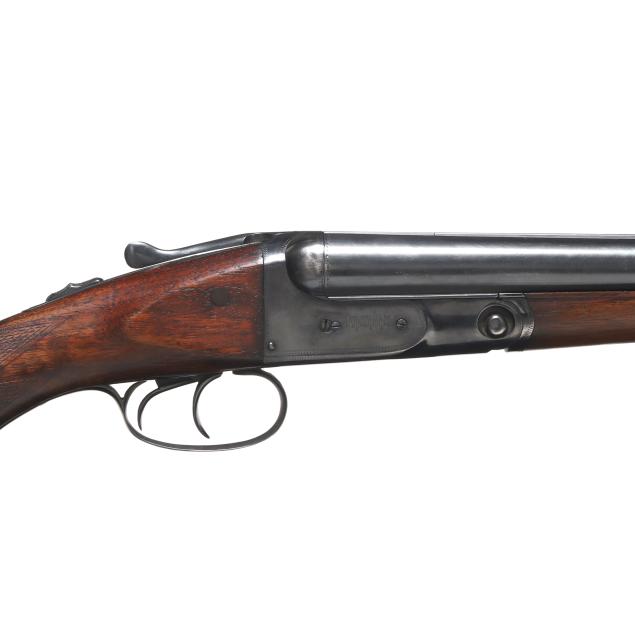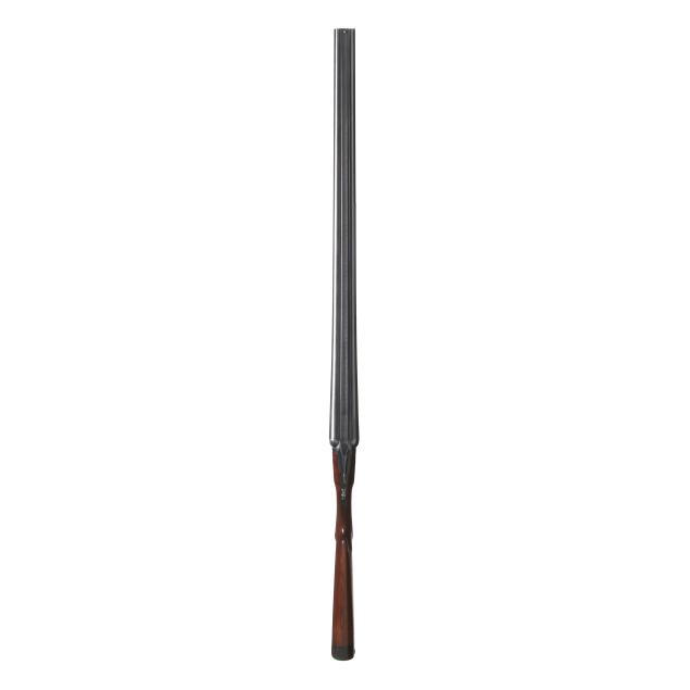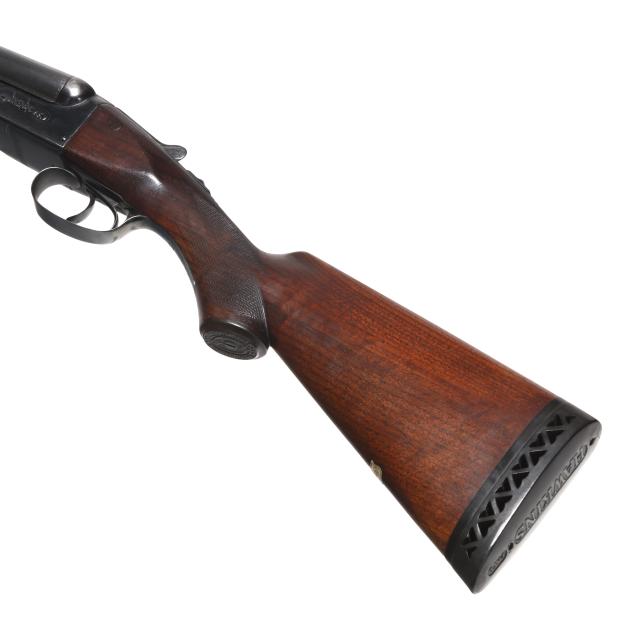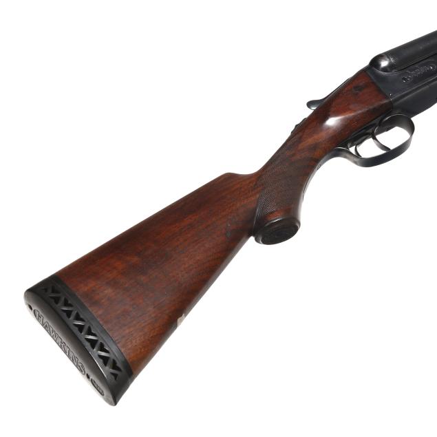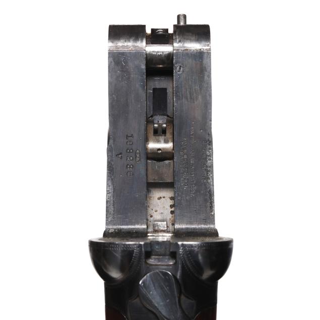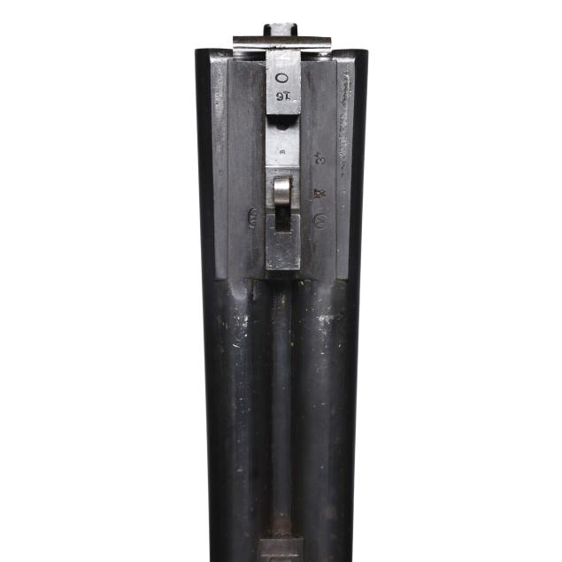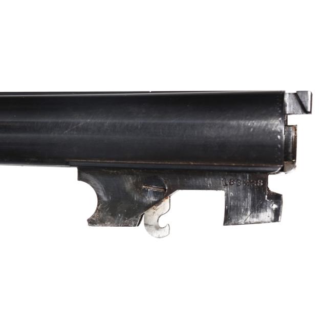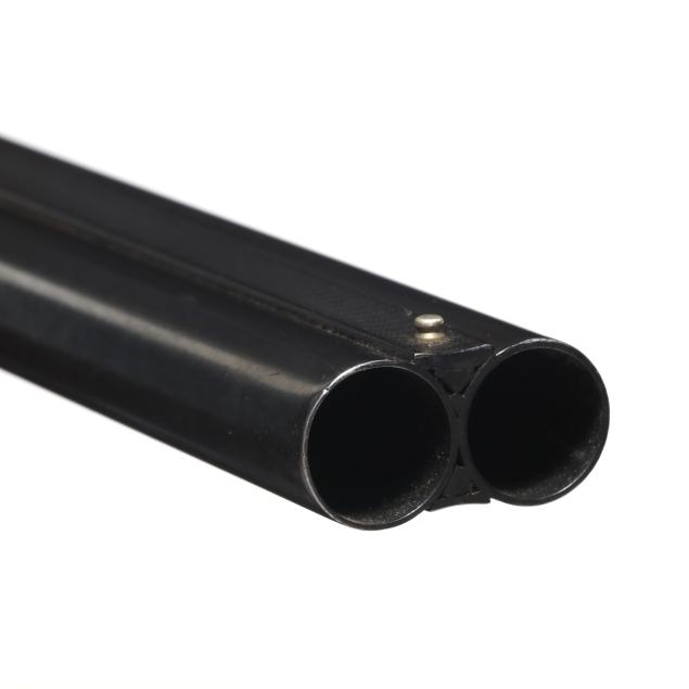 Overall fair estate condition, barrel bluing is strong and applied over past scattered light pitting, top rib indicates barrel length previously trimmed, bright and shiny bores, barrels ring with clear church bell tone, barrel to receiver fit is tight, forend fit is slightly loose, blued recevier, top lever and forend components, moderate screw slot damage, stock finish healthy, buttstock head previously repaired with a dowel through the cheeks, checkering is complete and largely pronounced albeit somewhat worn, HAWKINS aftermarket recoil pad is well fit and remains pliable.