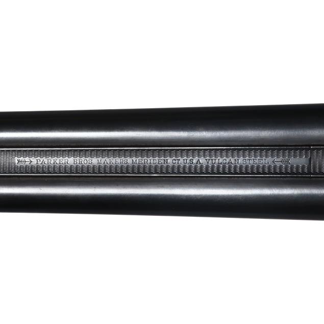 Serial number 183238 present on barrel lug, water table, forend iron and trigger guard, frame size stamp of 0, grade marked V on water table, text of PARKER BROS. present on sides of blued boxlock action receiver, text of PARKER BROS. MAKERS. MERIDEN, CT. U.S.A. VULCAN STEEL on matted rib of 27 15/16 in. barrel with single bead, double triggers, automatic safety, capped pistol grip checkered walnut buttstock with after market recoil pad, checkered walnut splinter style forend, evidence of buttstock head dowel repair in the cheeks.