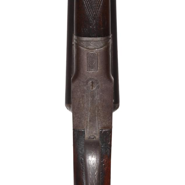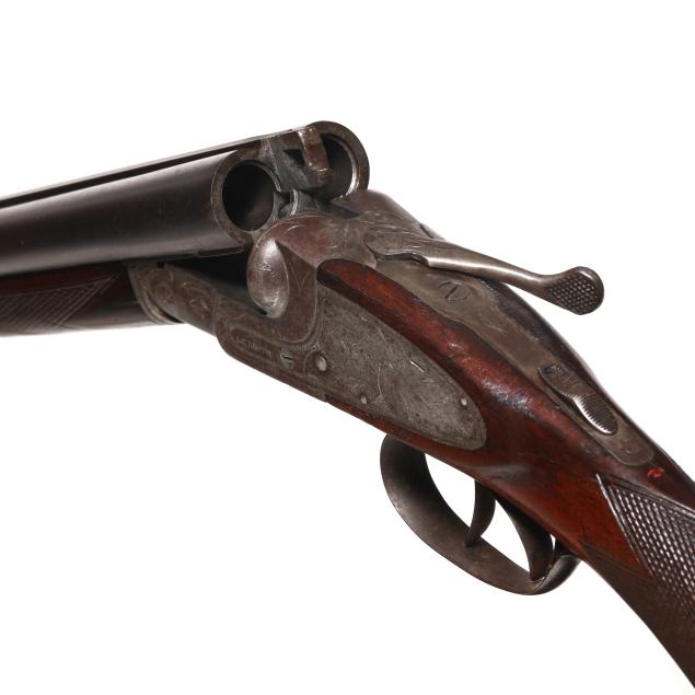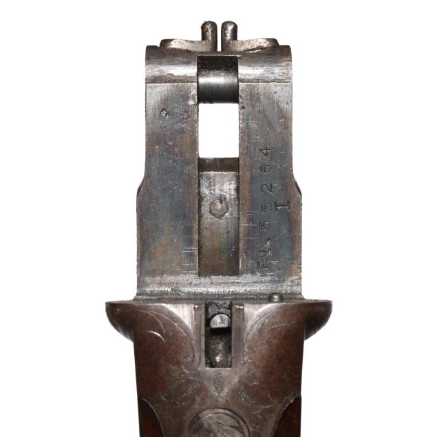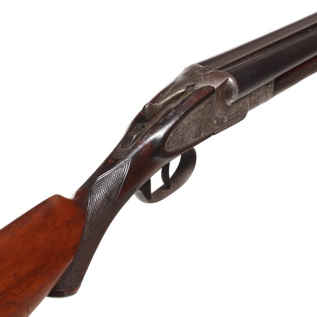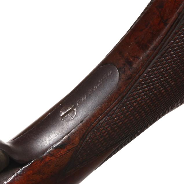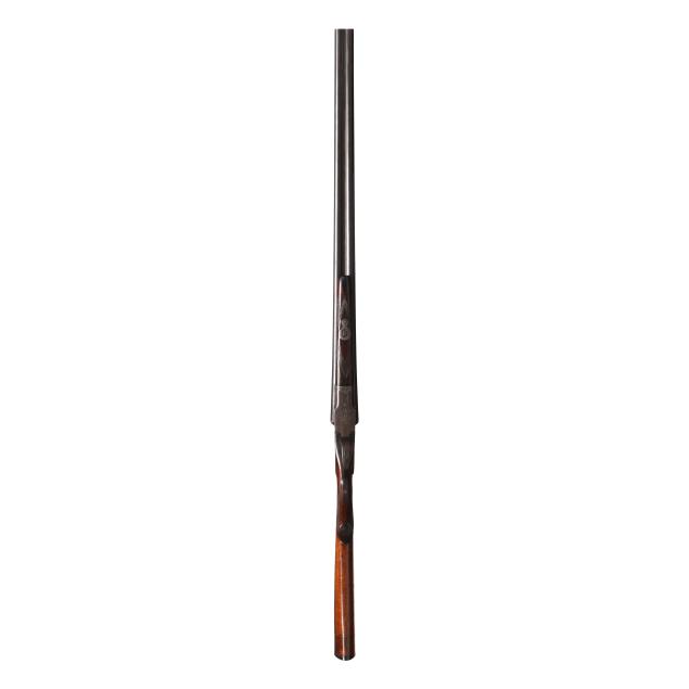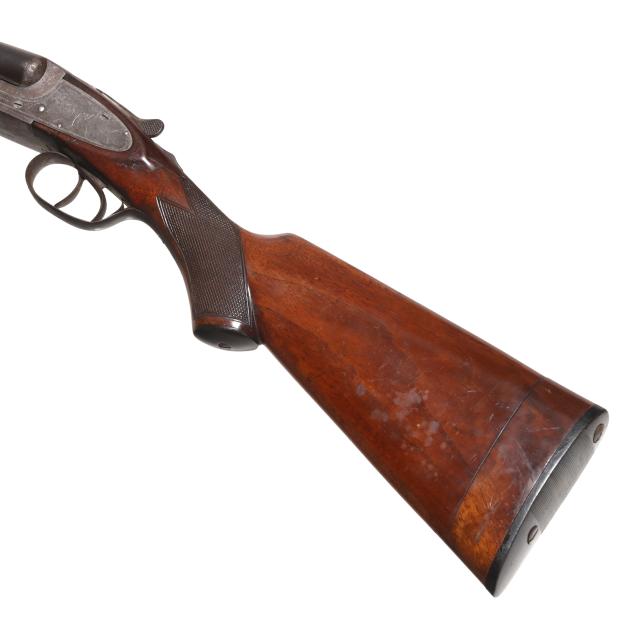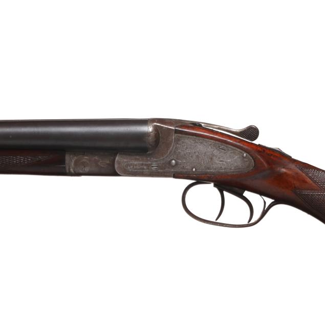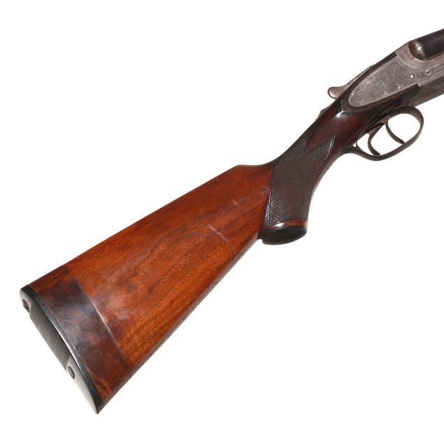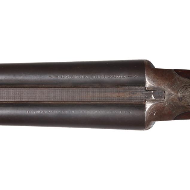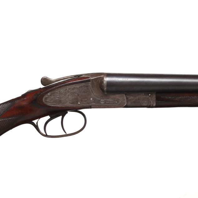 Serial number 55264 present on water table, trigger guard, barrel flats and forend iron, frame size designation FW present on water table, trigger guard and barrel flats, grade designation of I present on water table, forend iron and barrel flats, text of L.C. SMITH IDEAL GRADE and HUNTER ARSM CO. INC. M'F'R'S FULTON N.Y. U.S.A. present on 28 in. blued barrel with matted top rib and single and middle beads, text of L.C. SMITH engraved within a foliage motif on lock plates of sidelock ejector action receiver, double triggers, three position manual safety, ejectors, capped pistol grip checkered walnut buttstock with walnut extension and factory buttplate, checkered walnut splinter forend.