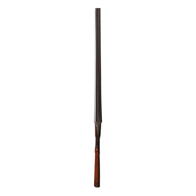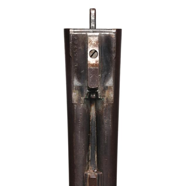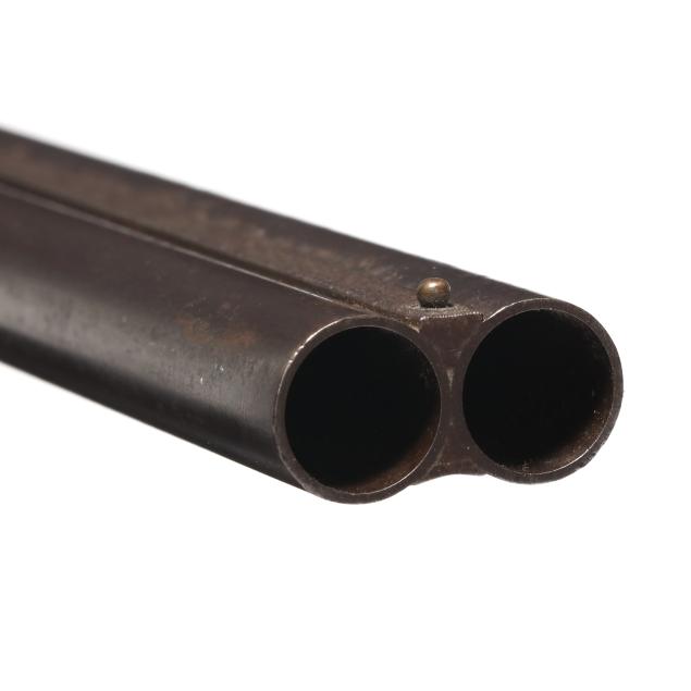 Overall poor estate condition, bluing has turned an old gun brown patina, bores shine and also have lightly rough texture, light surface rust covers remaining metal components, stock finish is intact with numerous moderate imperfections, wood stock extension is poorly matched.