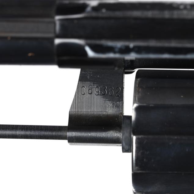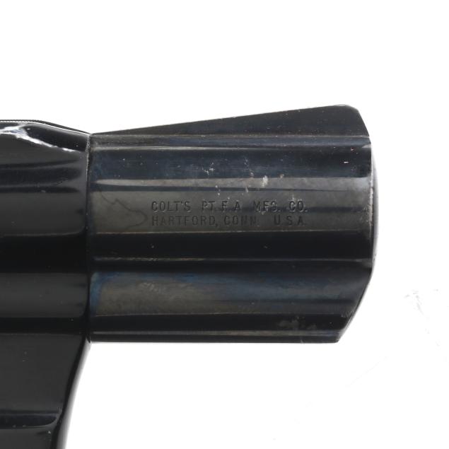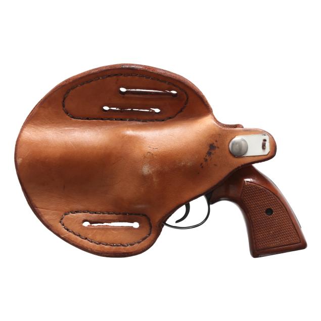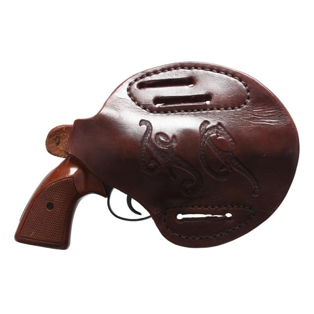 Serial number C89362 present on inside of frame near crane as well as crane itself, anodized aluminum frame, 2 1/8 in. blued steel barrel, shrouded ejector rod, checkered wood grip scales, brown leather personalized pancake holster.