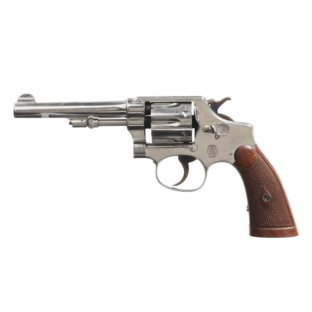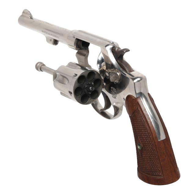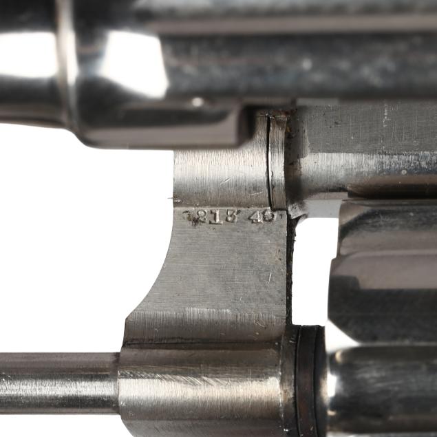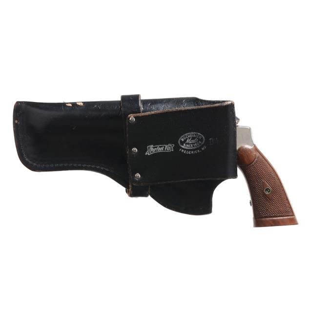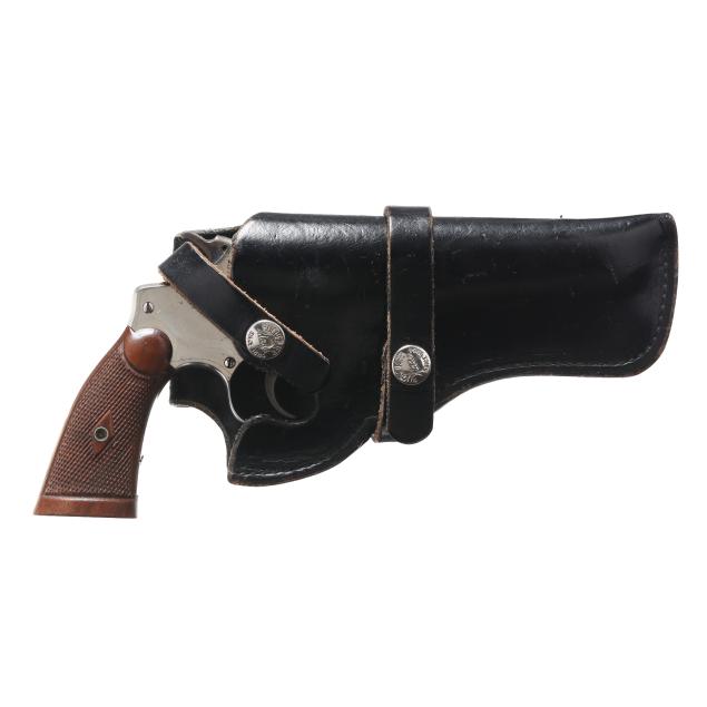 Serial number 21364 present on inside of frame behind crane and on crane itself, characters 379208 present on underside of barrel and front strap, bright nickel plating, single and double action, 4 1/2 in pinned barrel with front sight blade, color cased hammer and trigger, checkered walnut grip scales, BUCHEIMER leather belt slide holster.