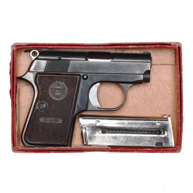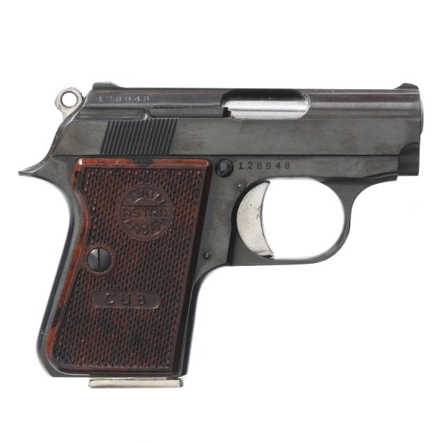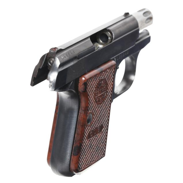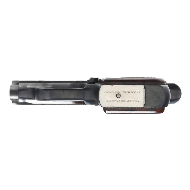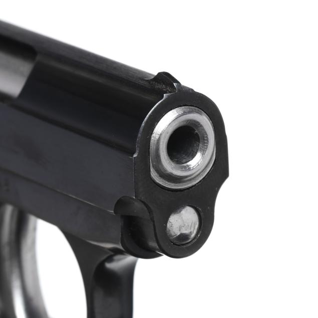 Serial number 128948 present on right side of blued steel frame and top of blued steel slide, 2 in. barrel, fixed front and rear sights, semi-automatic action, magazine disconnect safety and rotating manual thumb safety, two bright chromed magazines, BAKELITE grip scales, factory box with manual and cleaning rode, black leatherette case.