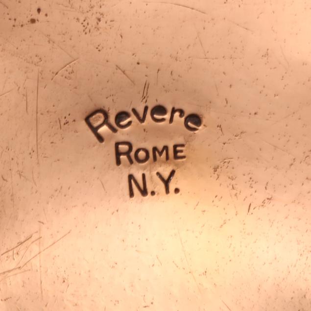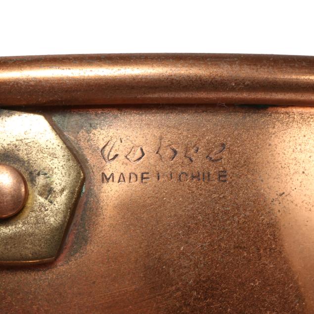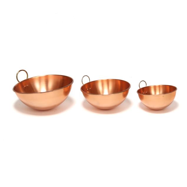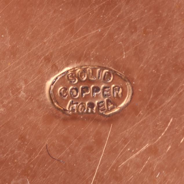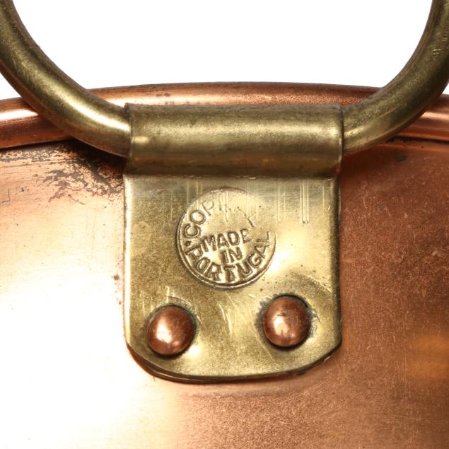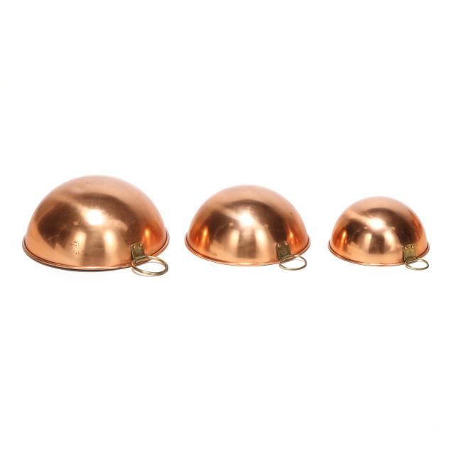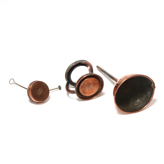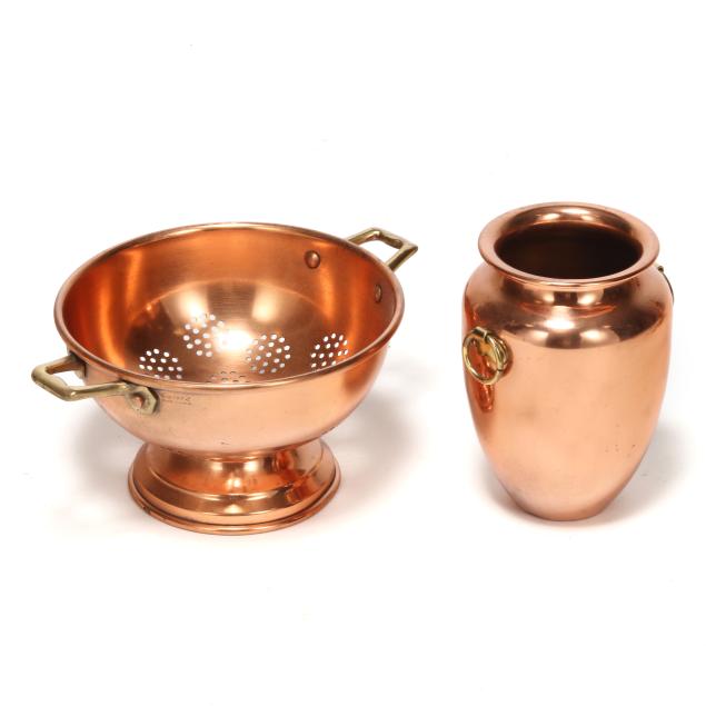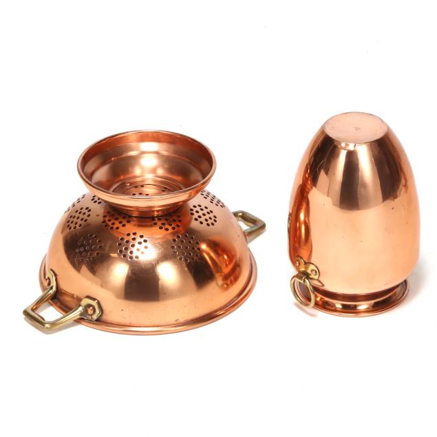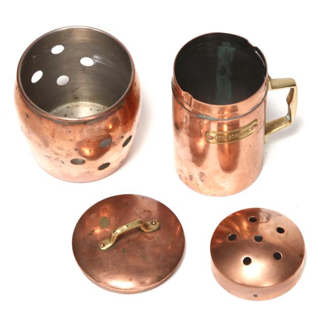 Scavullo solid copper charger (11 1/4 in. diameter); a Revere urn with dual brass ring handles (7 7/8 in.); a lidded garlic keeper, unmarked (5 1/2 in.); a large cheese shaker with brass handle and plaque reading "CHEESE" to body, marked to underside (6 1/4 in.); a funnel, unmarked (12 in. length); (3) Copral stacked mixing bowls with brass ring handle (largest 9 1/2 in. diameter); a Cobre strainer with dual brass handles (9 3/8 in. diameter; and (3) measuring cups with brass handles, unmarked (1 cup, 1/2 cup, 1/4 cup).