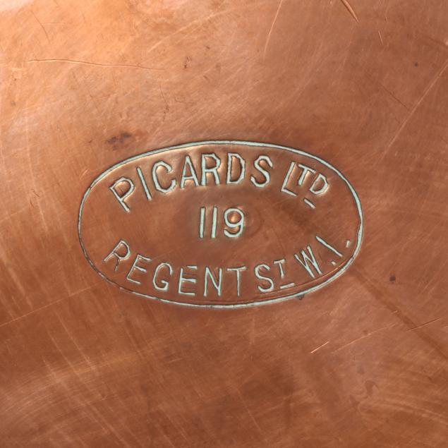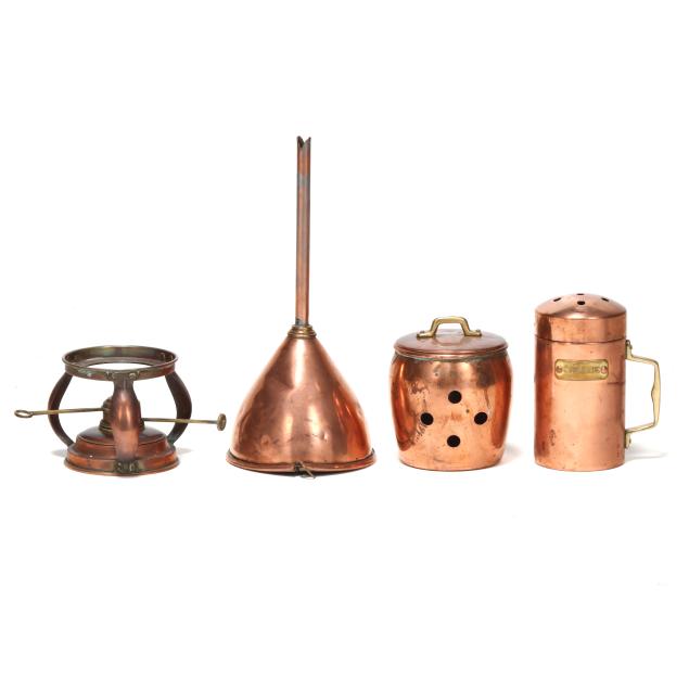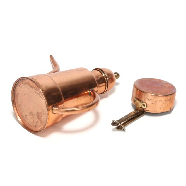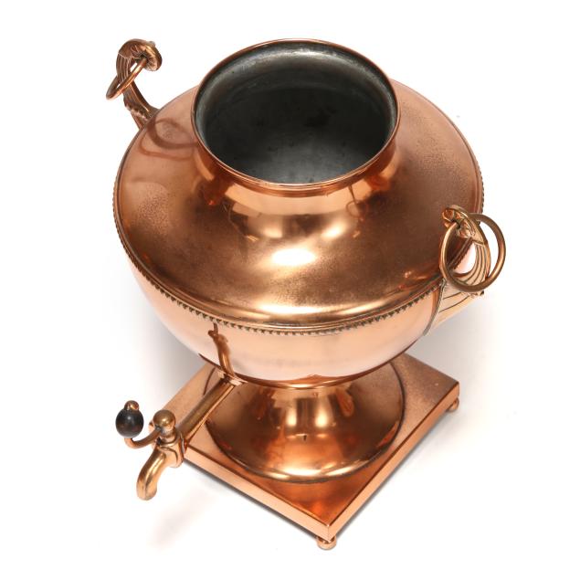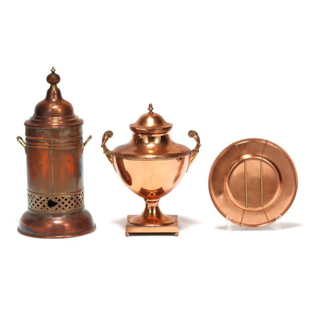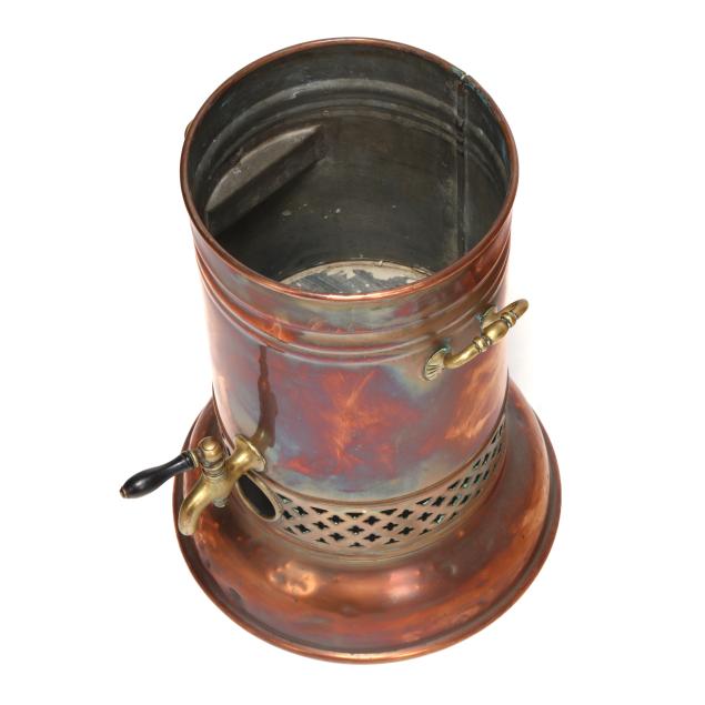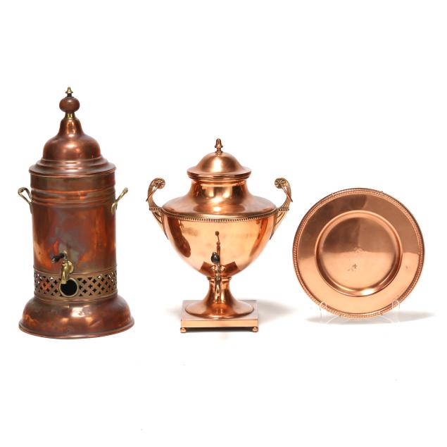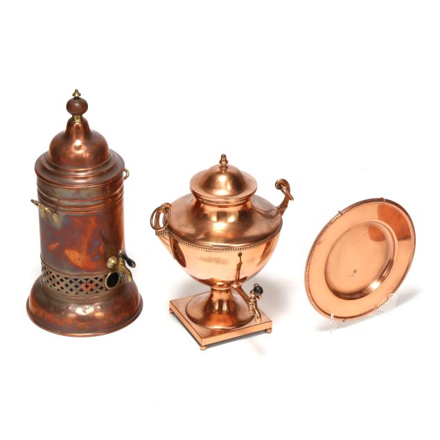 (16) copper and metal pieces, to include a burner stand, marked "PICARDS LTd." to underside (4 in.) that can be used with the copper samovar with dual brass handles, reticulated brass base, and turned wood ball finial, unmarked (21 x 10 in.); an urn form samovar mounted to square plinth atop four ball feet, unmarked (16 x 13 in.); a lidded olive oil pourer (9 3/4 in.); a Legion Utensils