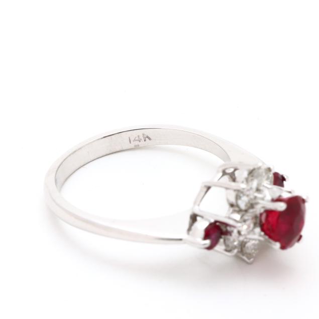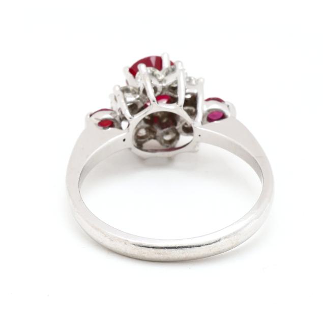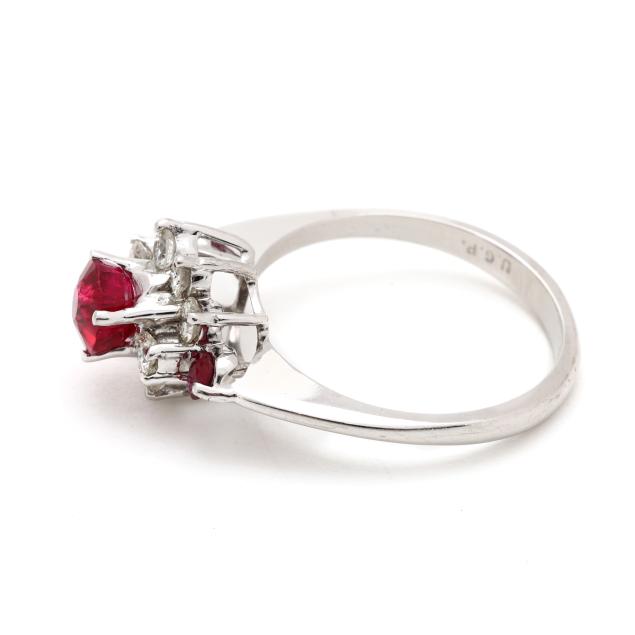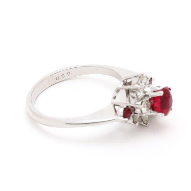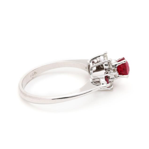 Centered on a round cut synthetic ruby (5.3mm) set within a halo of full cut round diamonds weighing approximately .50 total carat (I-J color, SI1-SI2 clarity), and set to each side with a round cut synthetic ruby (2.5mm), stamped 14K and with maker's mark U.G.P.