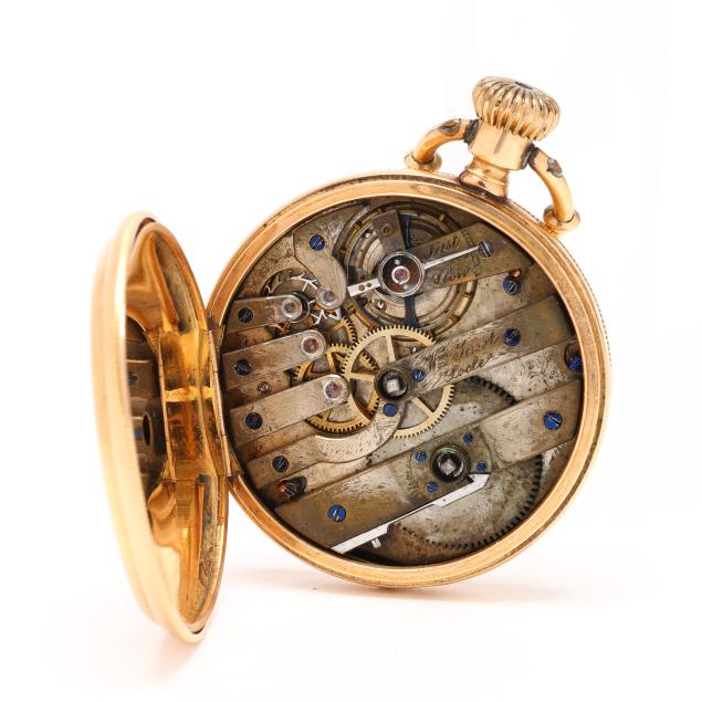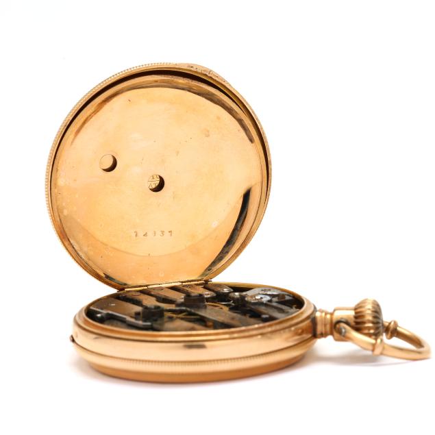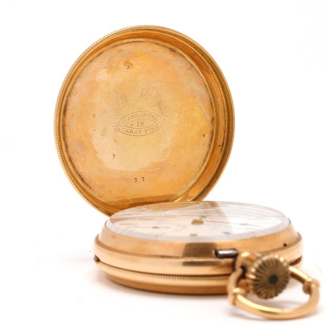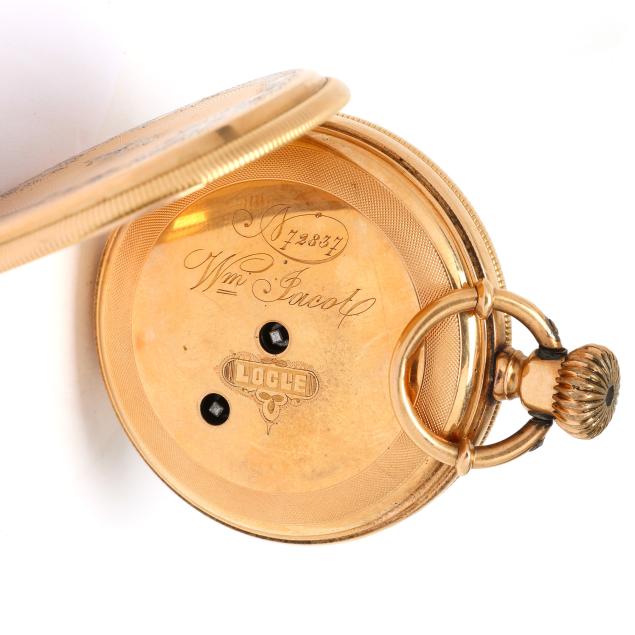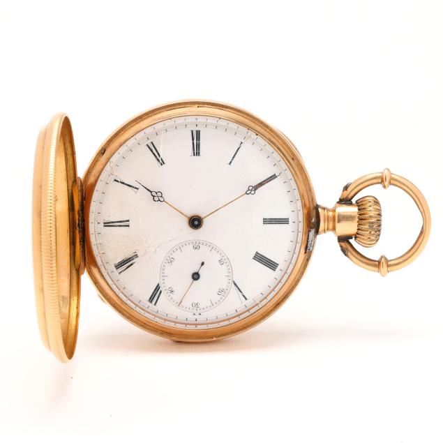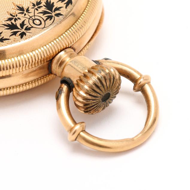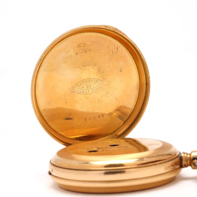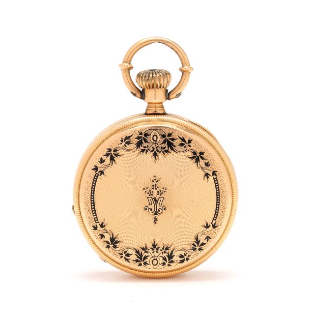 Key wind and set, serial number 72837, the gold hunting case with engine turning, black enameled foliate and floral detailing, and black enameled cartouche, the unsigned dial with black Roman numeral hour markers, gold and blued steel filigree hands, the caseback interior stamped Warranted / 18 / Karat Fine, the cuvette signed and numbered. Key present.