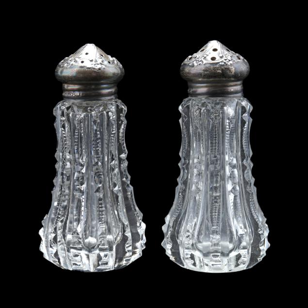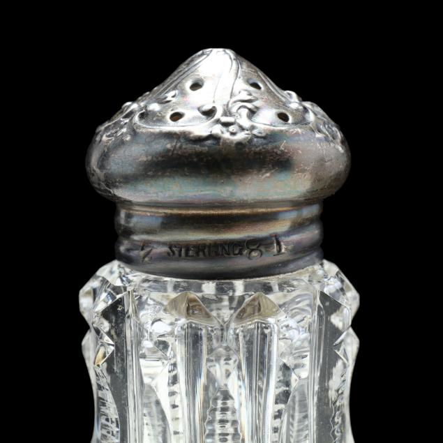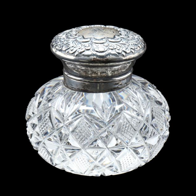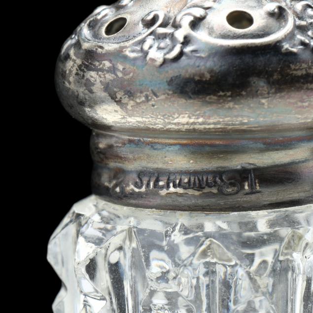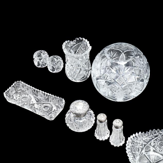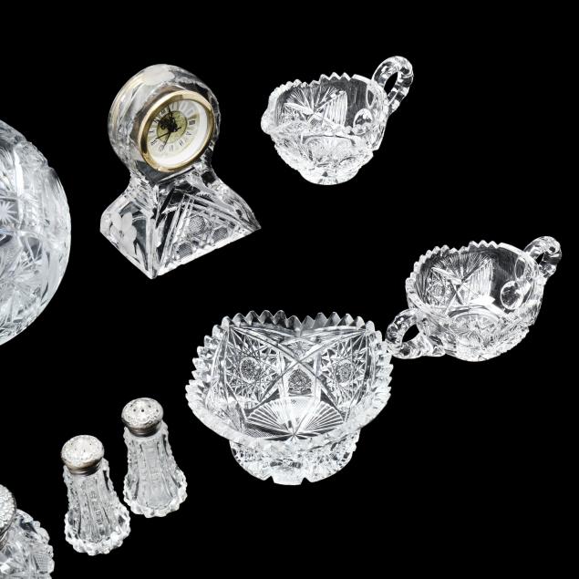 Pieces ranging from circa 1900-1970, including a rose bowl, table clock, creamer and sugar, pair of napkin rings, celery vase, rectangular dish, scalloped rim bowl, sterling silver lidded ink well (monogramed M), and a pair of sterling silver lidded shakers.