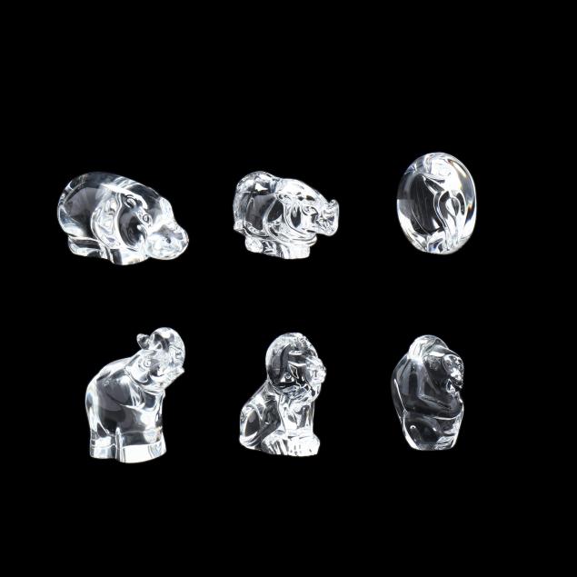New York, late 20th century, including an elephant hand cooler, raised trunk elephant, monkey hand cooler, rhino hand cooler, hippo hand cooler, and a lion, all signed.