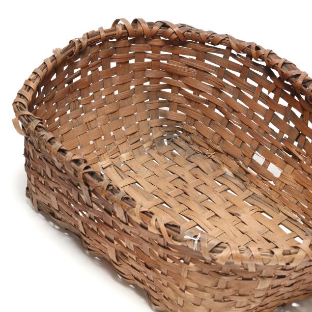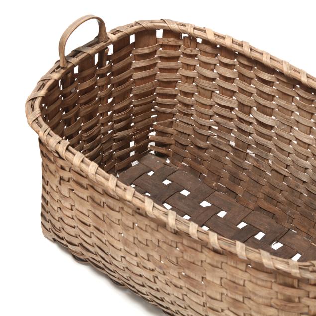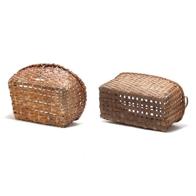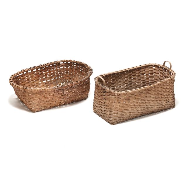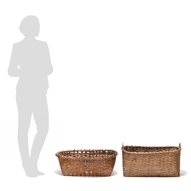 Early 20th century, woven oak splints with bentwood rim, unmarked, the taller with carved and notched dual handles (13 x 24 x 15 in.), the shorter with oval rim (9 1/2 x 25 1/2 x 18 in.).