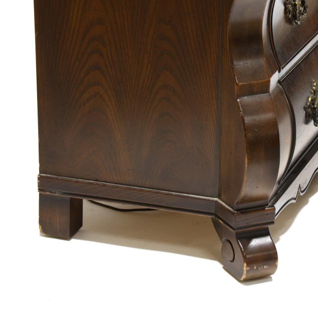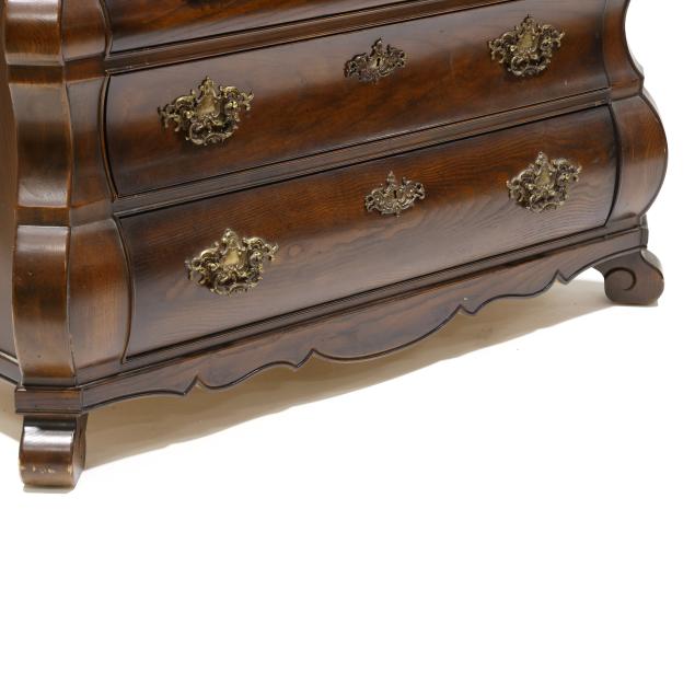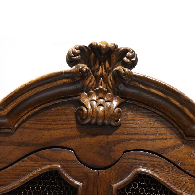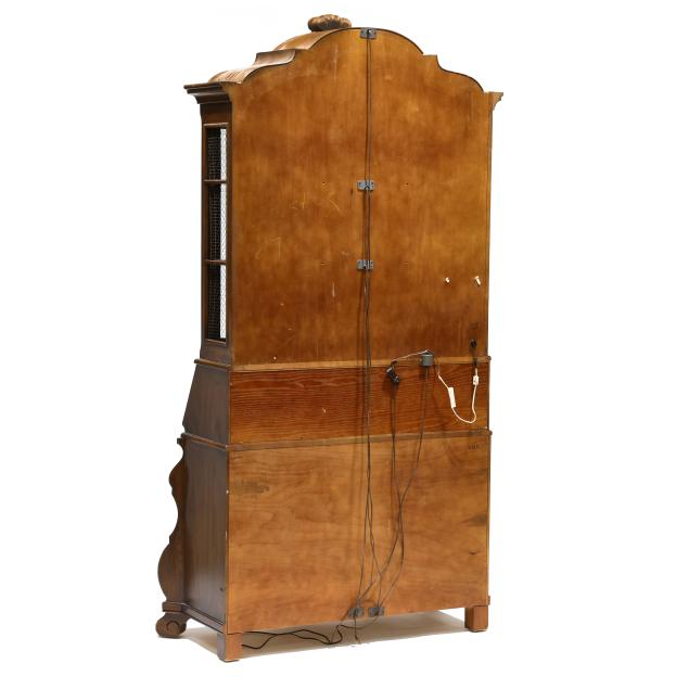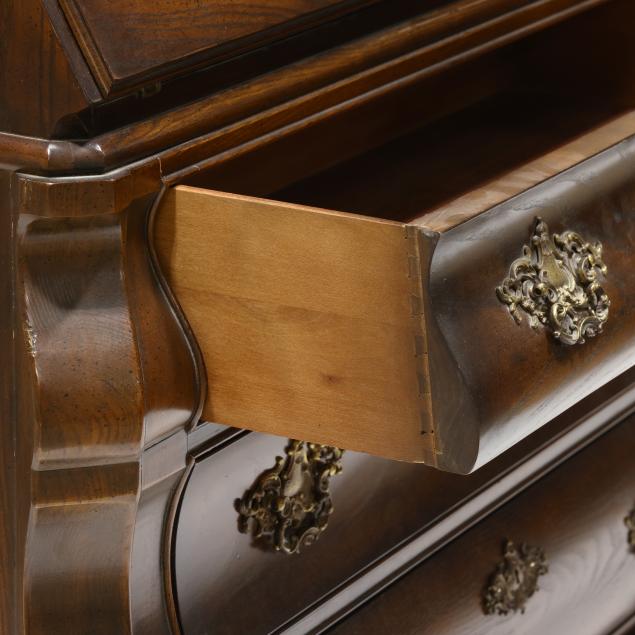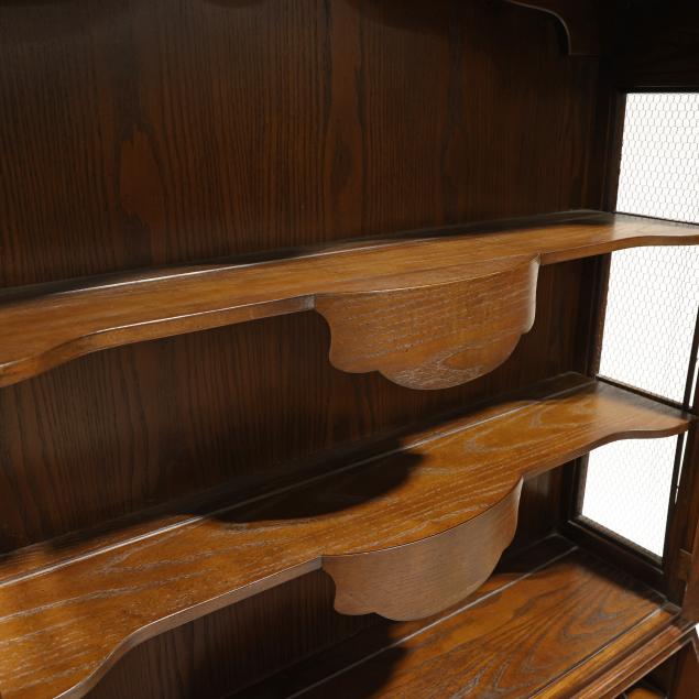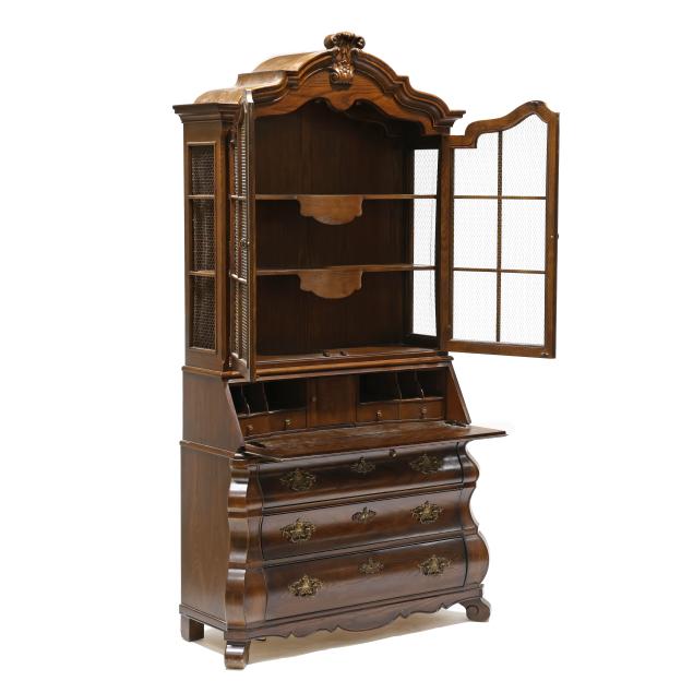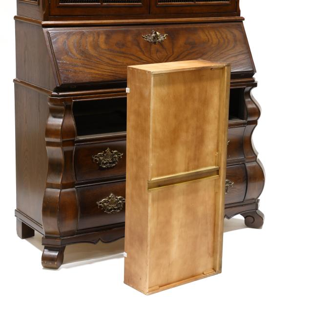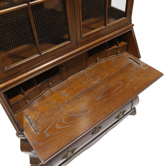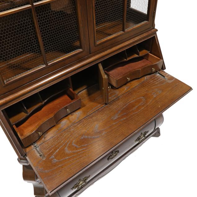 Mid-20th century, two part form, oak, upper case with French style chicken wire panels, shelved interior with dish grooves, the base with hinged slant lid, divided interior with prospect door and two drawers, over three bombe drawers, scrolled feet, labeled.