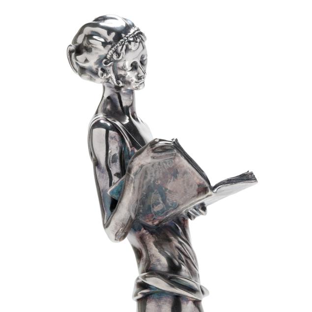 Florence, likely after a model by Giuseppe Armani, marked "150g" and "925" with post 1968 Italian National marks for Firenze (FI), depicting a standing Art Deco lady reading, mounted atop a red stone base.