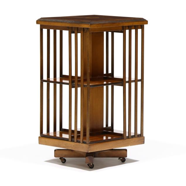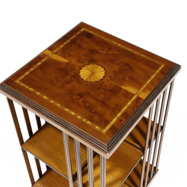 Late 20th century, burl wood and mixed fruit wood veneers, square top with inlaid central pinwheel and banded edge, two open shelves with slat panels, rotating base on casters.