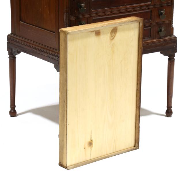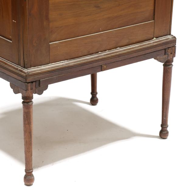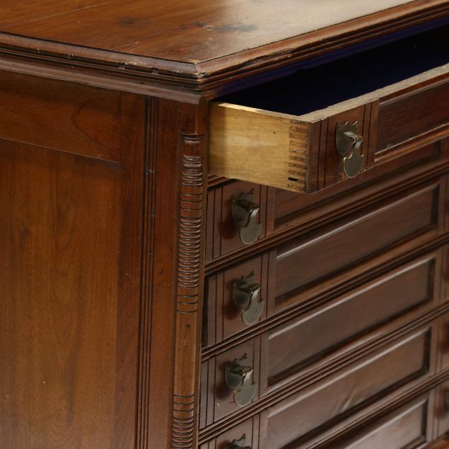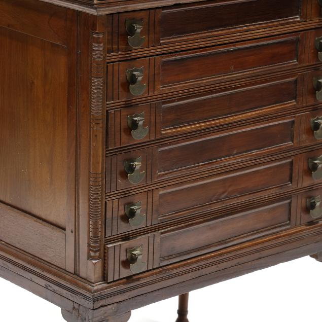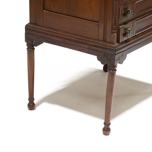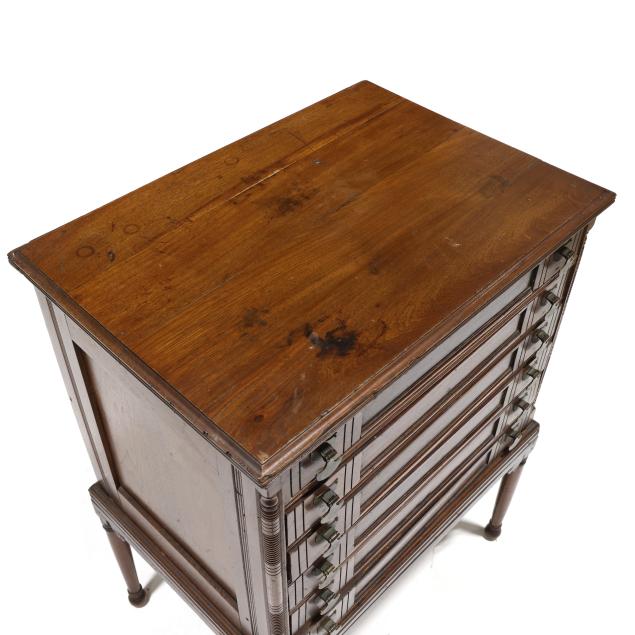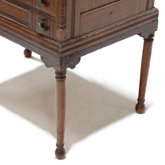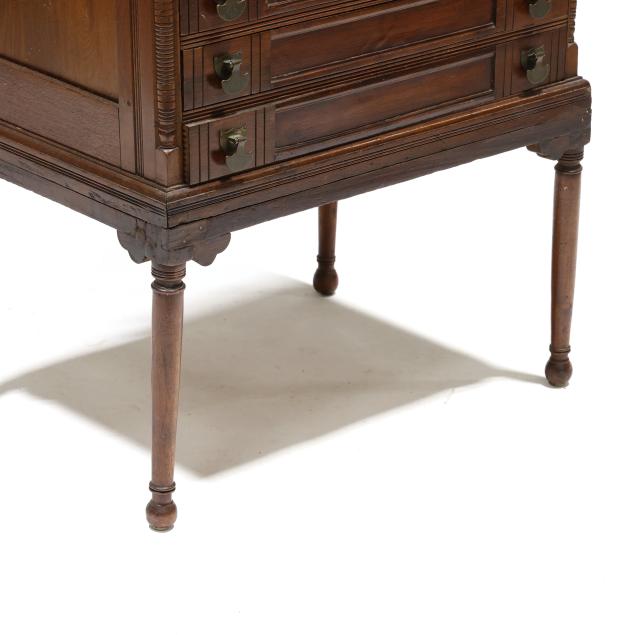 Circa 1890, rectangular top with molded edge, six paneled and incised decorated drawers, paneled sides, turned legs.