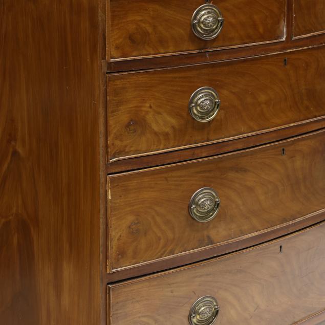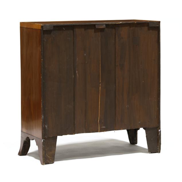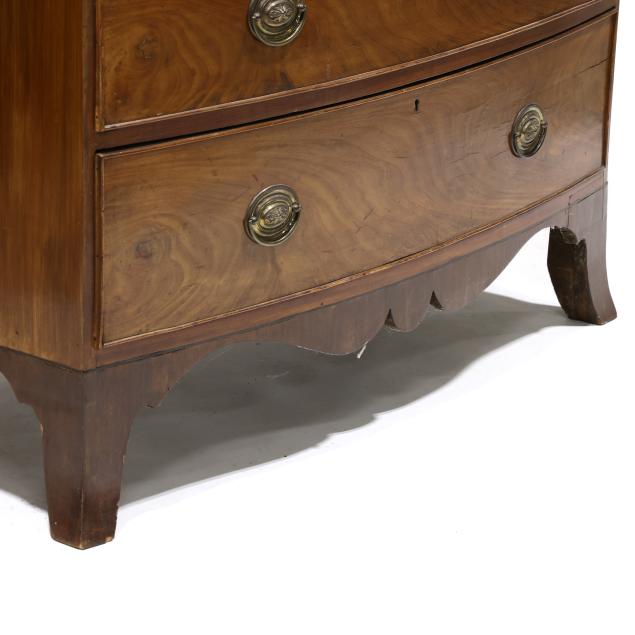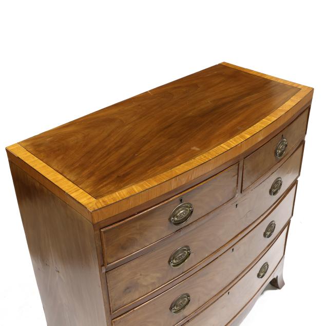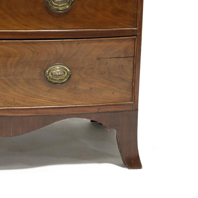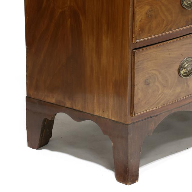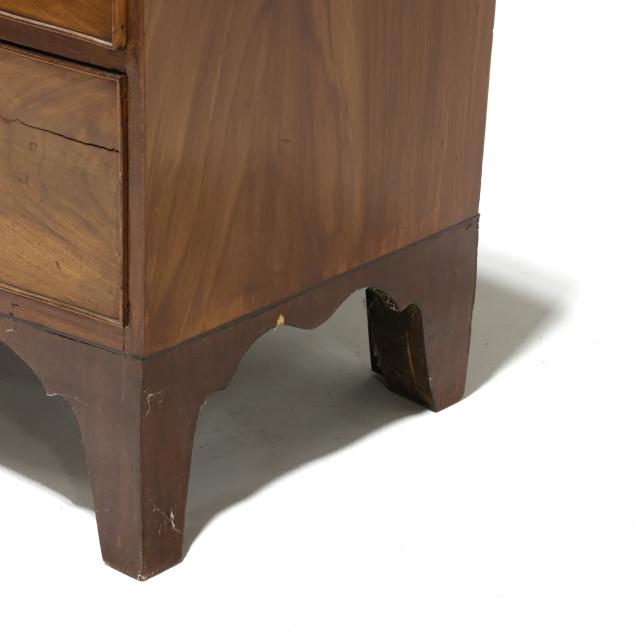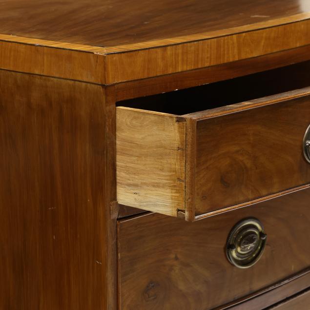 Circa 1800, mahogany veneer with light and dark wood banded inlays throughout, two over three graduated cock beaded drawers, scalloped skirt on French bracket feet.