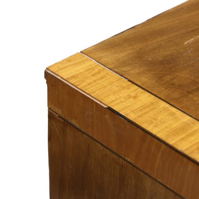 Top with surface scraping; later pulls with central hole; some stiffness to drawers when opening/closing; some cock beading loss; rear left foot with break and repair.