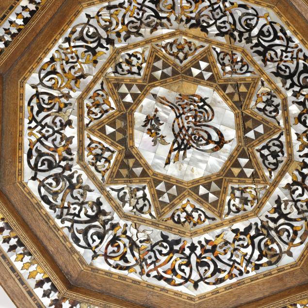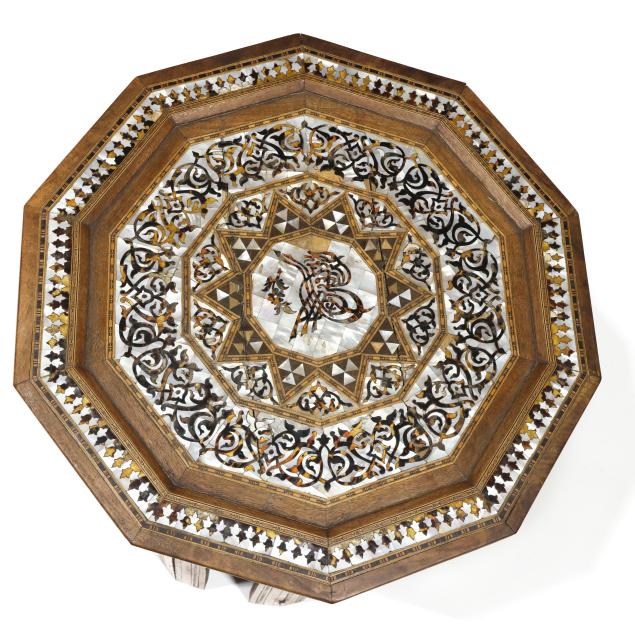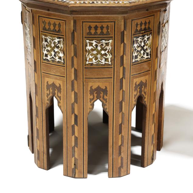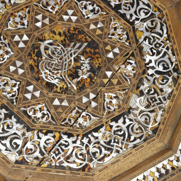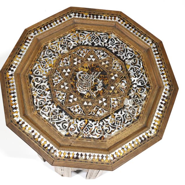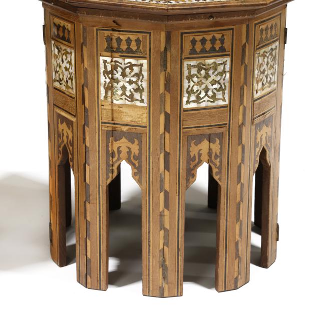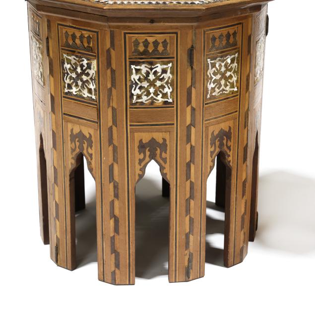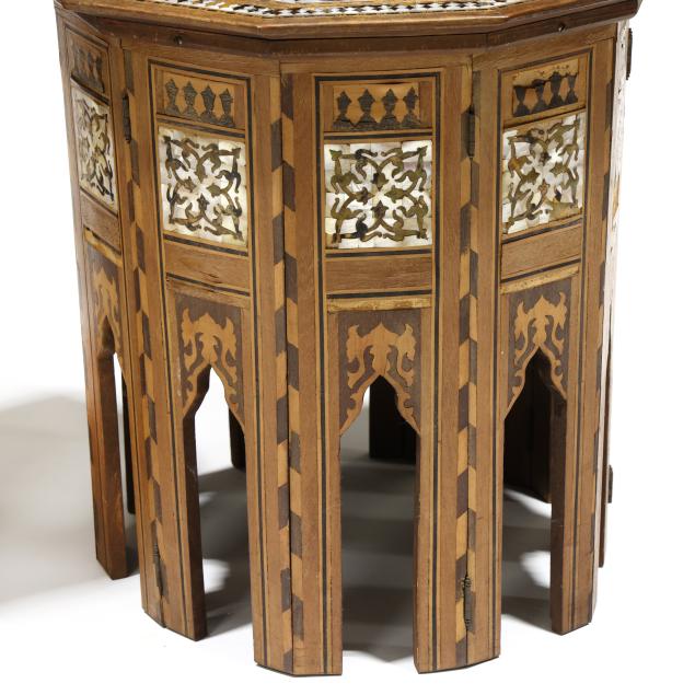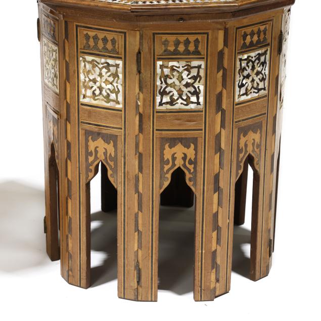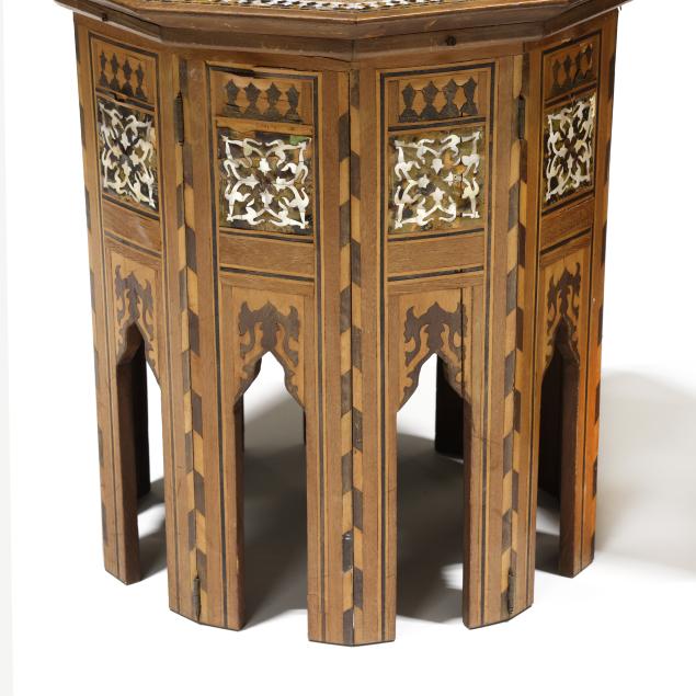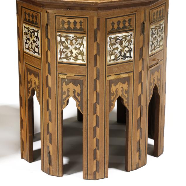 Early 20th century, labeled "Made in Turkey", octagonal form molded edge top, conforming paneled sides with arched cut-out legs, all over mother of pearl, tortoiseshell, light and dark wood inlays.
