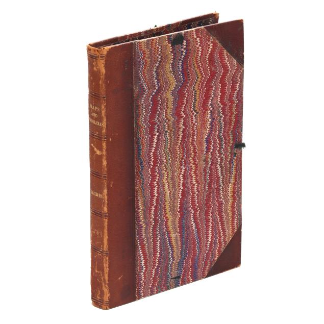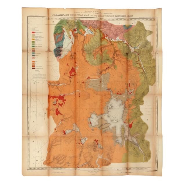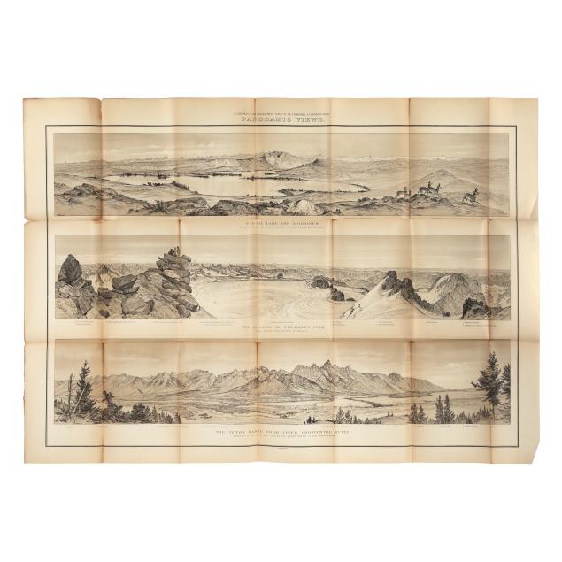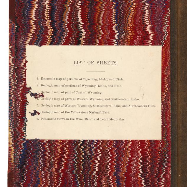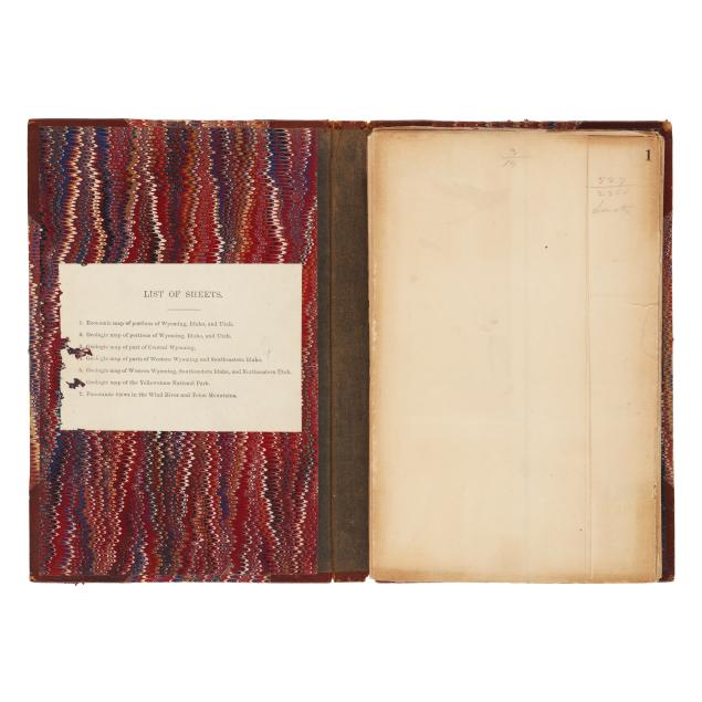 F. V. Hayden. MAPS AND PANORAMAS. TWELFTH ANNUAL REPORT OF THE UNITED STATES GEOLOGICAL AND GEOGRAPHICAL SURVEY OF THE TERRITORIES. Washington: Department of the Interior, [1883]. Includes (10) folding maps of Wyoming, Idaho, Yellowstone National Park, and the Tetons, with six of the maps in color; loose, as issued, and contained in a later 8vo half leather over marbled paper-covered boards portfolio with gilt lettering on the spine. With seven of the maps/panoramas listed on the front paste-down, and all ten with ink-stamped number. Includes the following: 1. Economic map of portions of Wyoming, Idaho, and Utah. 2. Geologic map of portions of Wyoming, Idaho, and Utah. 3. Geologic map of part of Central Wyoming. 4. Geologic map of parts of Western Wyoming and Southeastern Idaho. 5. Geologic map of Western Wyoming, Southeastern Idaho, and Northeastern Utah. 6. Geologic map of Yellowstone National Park 7. Panoramic views in the Wind River and Teton Mountains 8. Part of Central Wyoming. 9. Parts of Western Wyoming and Southeastern Idaho. 10. Parts of Western Wyoming, Southeastern Idaho and Northeastern Utah.