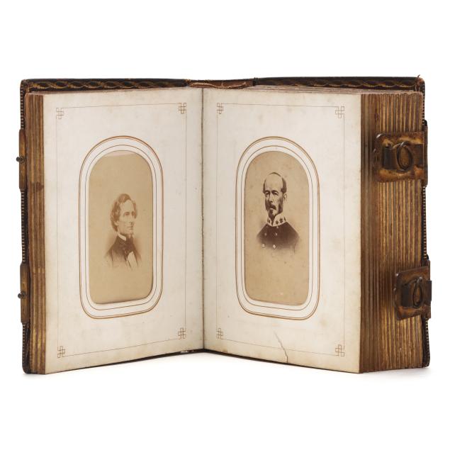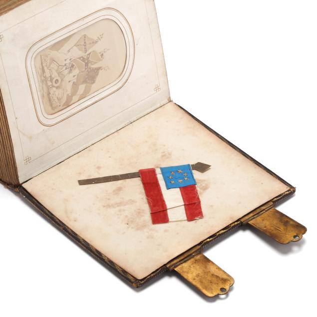 The first image is a composite photograph with A. P. Hill, Richard Ewell, Braxton Bragg, Albert Sidney Johnson, John Magruder, Sterling Price and Leonidas Polk; following sitters include R. E. Lee, Stonewall Jackson, A. P. Hill, James Longstreet, Jefferson Davis, Albert Sidney Johnston, P.G.T. Beauregard, John Hunt Morgan, Richard Ewell, a second R. E. Lee, and a second Albert Sidney Johnson. The civilians are largely postwar men and women with a few war-date CDVs present. The last CDV is a tableaux showing three Confederate flags. Resting opposite, on the back endpaper, is a small rebel "Bible flag" modeled after the Confederacy's first national flag.