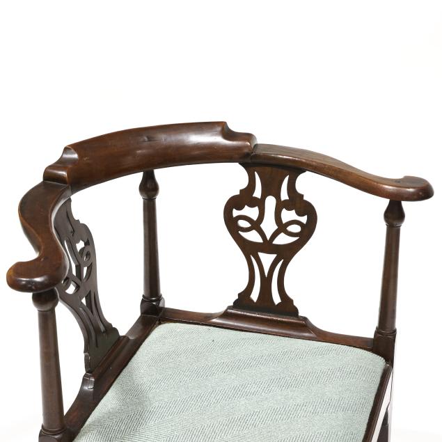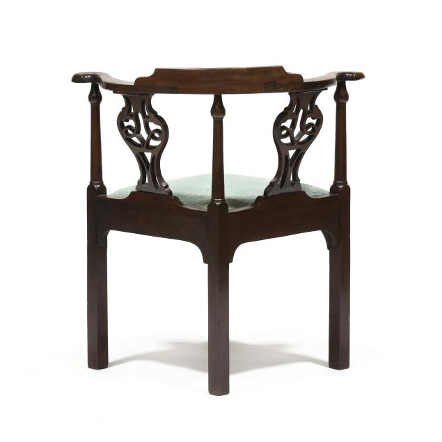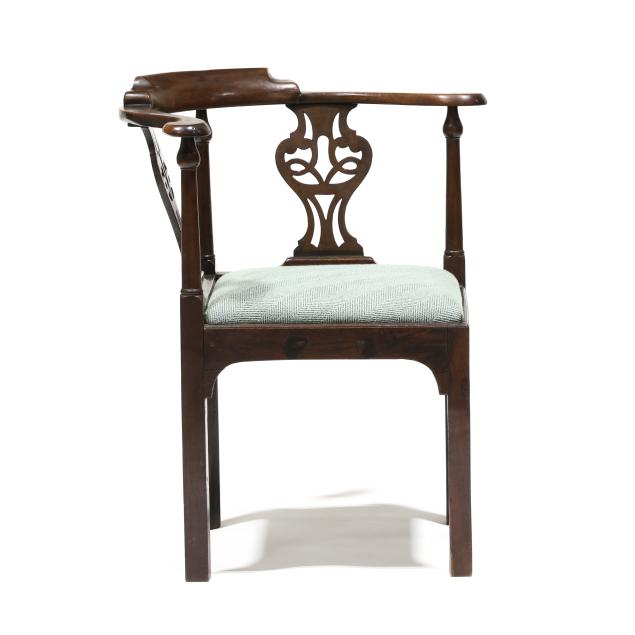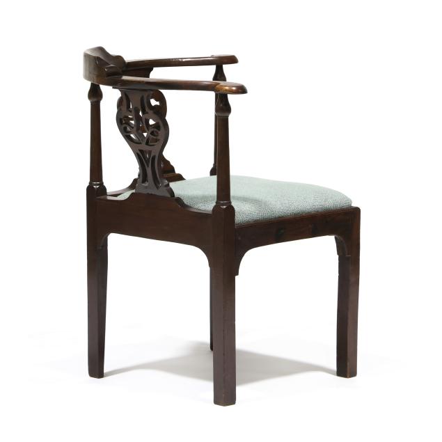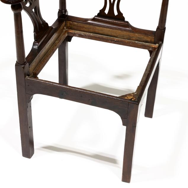 18th century, shaped arms and raised crest rail, double pierced back splat with turned supports, molded seat rail, slip seat, straight legs with arched returns.
