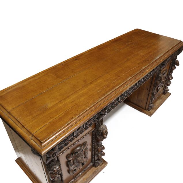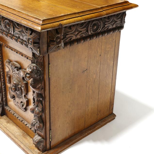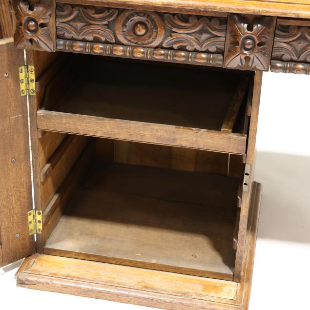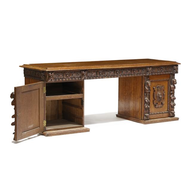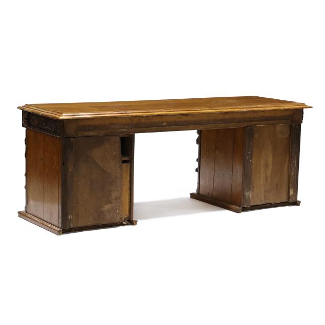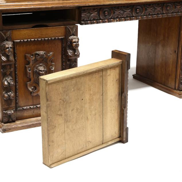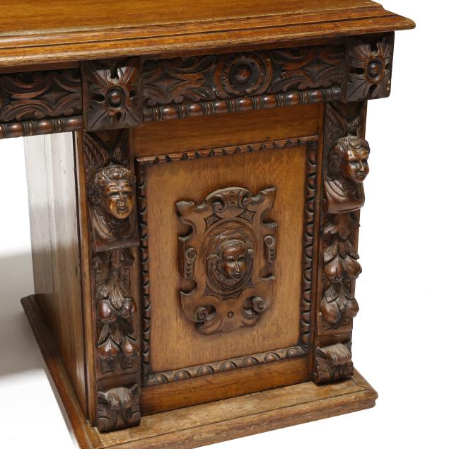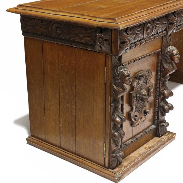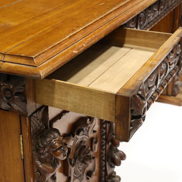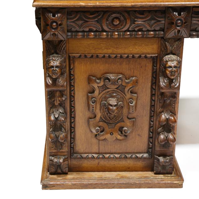 Late 19th century, three part form, top with molded edge, three relief carved convex drawers with carved rosette stiles, double pedestal supports with relief carved cherub mask panels, interior with fitted drawers, flush molded base.