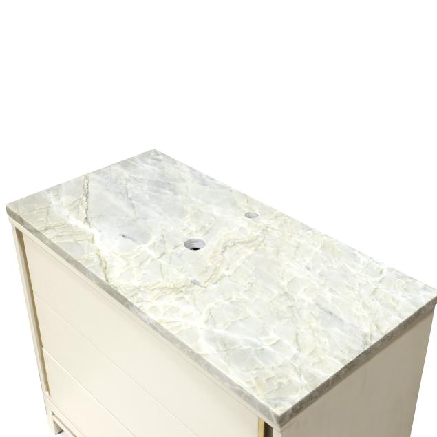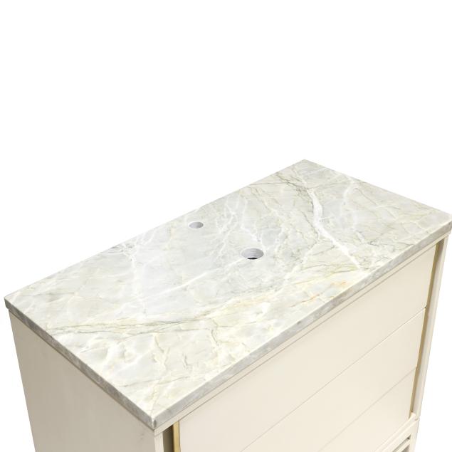 Mid 20th century, pale grey/green polished marble top drilled for sink and plumbing access, ivory tone painted wood case with two gilt highlighted drawers, straight legs.