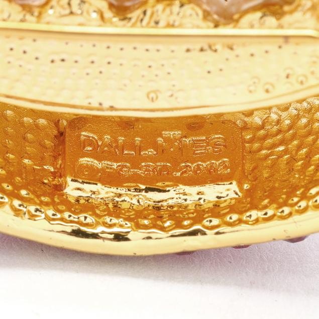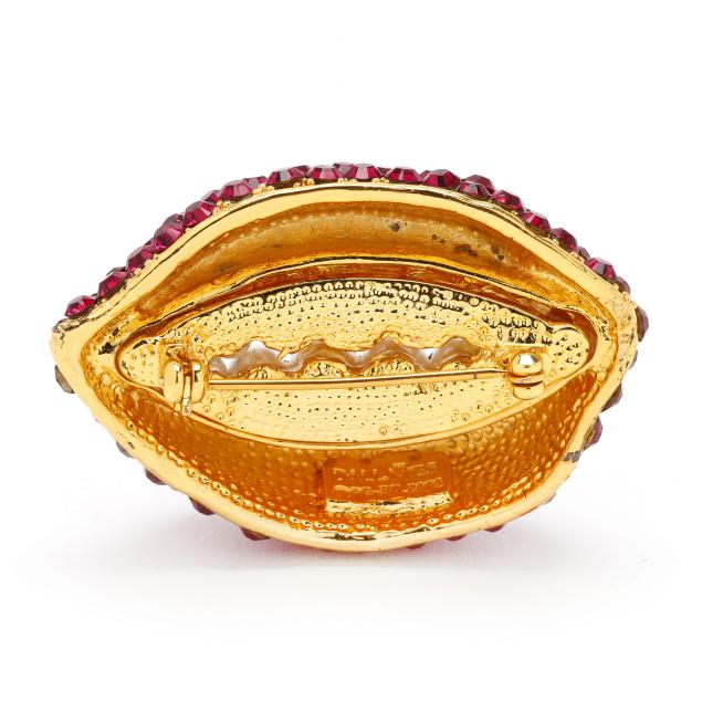 Contemporary production by Joies, gold tone metal with faux pearls and red stones meant to resemble the cliché saying: "ruby red lips and pearly white teeth," marked.