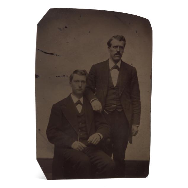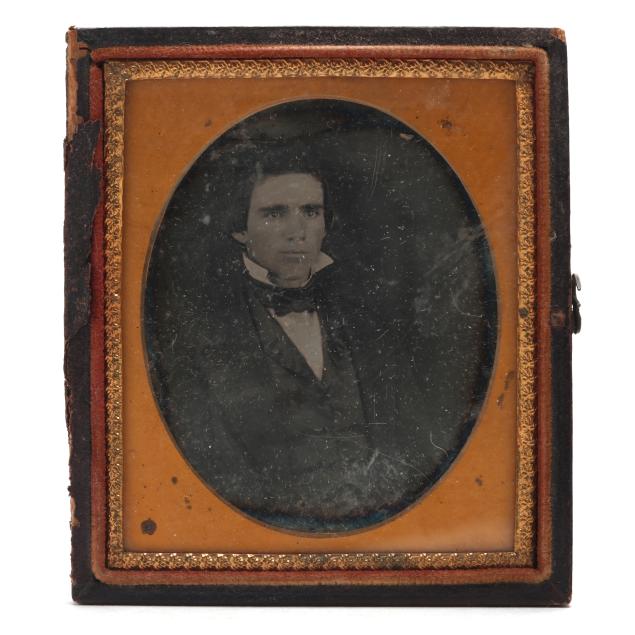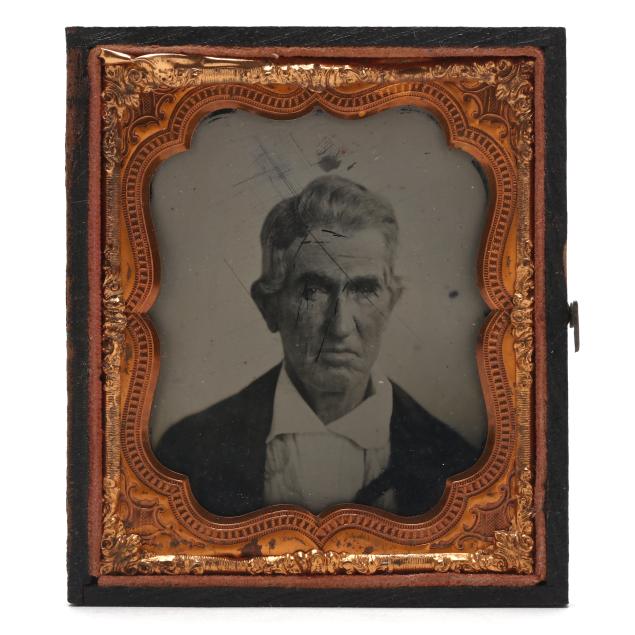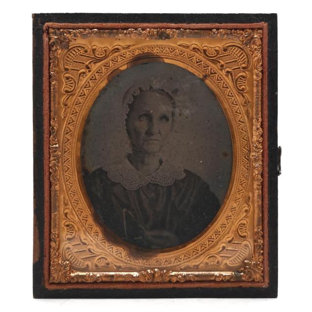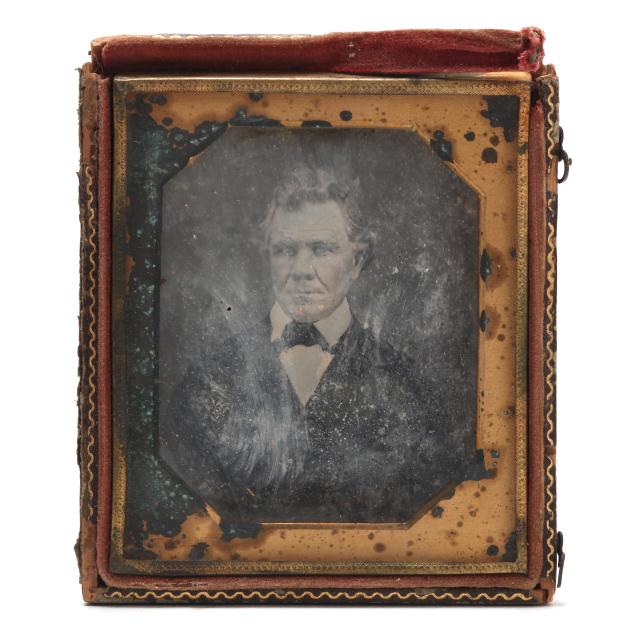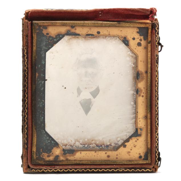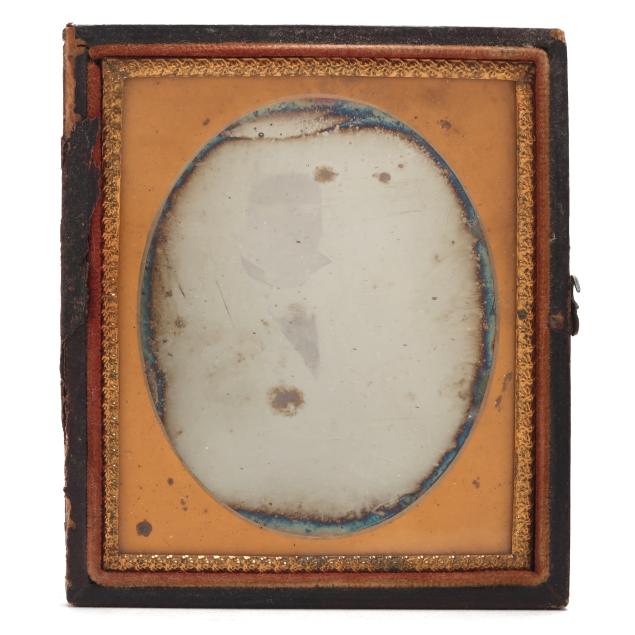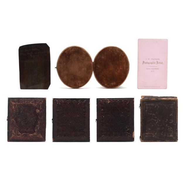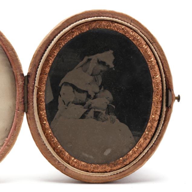 To include: two (2) sixth plate daguerreotypes, one of a young man (with full 2-part case, lid loose, some marks to the image) and another of an older gentleman in a half case stamped "T. ZEALY" on the frame (Zealy worked in Camden and Columbia, South Carolina before the Civil War.); plus...two (2) ambrotypes, one of an elderly man and another of an elderly lady (both photos lack lids, scratches to the emulsion on the man's image); plus a cased tintype, 1860s or 1870s, showing a young mother breastfeeding her baby (some blistering to the image's peripheral emulsion);...a second tintype identifies two gentlemen as "
