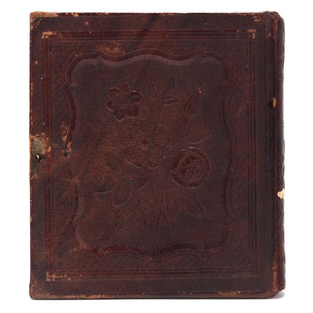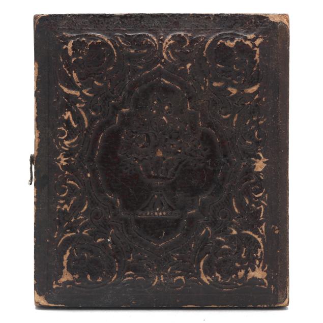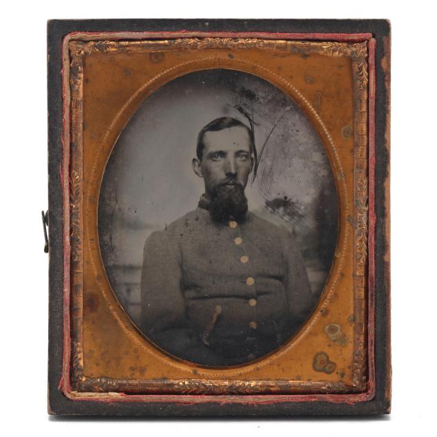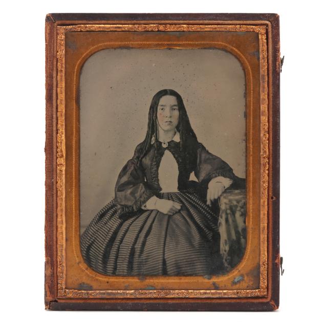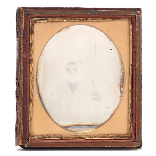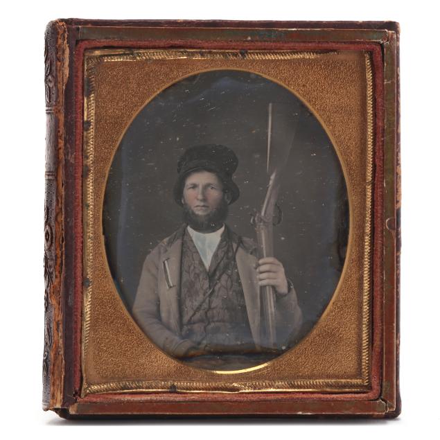 To include: a sixth-plate tinted daguerreotype, circa 1850, of a well-dressed hunter holding a double-barreled percussion shotgun while sporting a powder horn on a sling. Lacking lid, else Very Fine condition; plus...a scarce half-plate ambrotype of an inscrutable young woman seated at a table. She wears a gilt wedding band and might very well be a Civil War bride. In full case with a loose cover. Trivial spotting, else Very Fine condition; plus...a sixth-plate tintype of a Confederate, possibly a junior officer, with insignia on his collar and a fighting knife on his belt. Case lacks lid. Some abrasions to his left