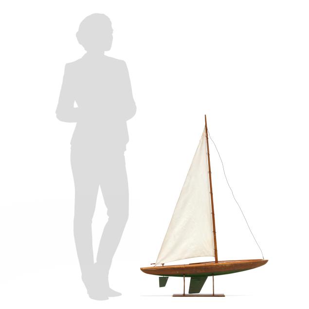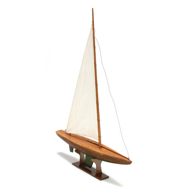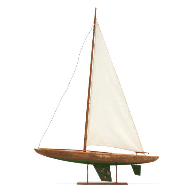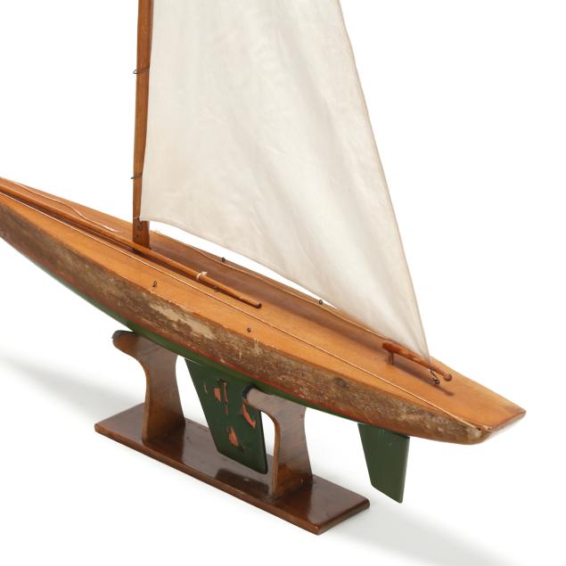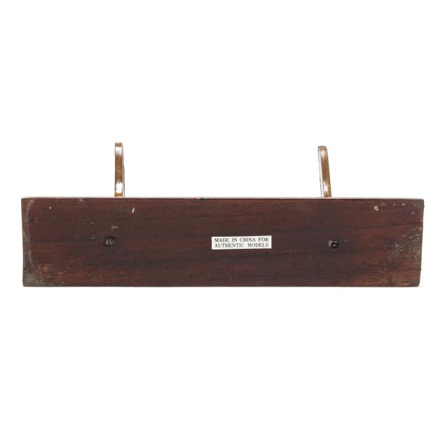 Late 20th century, painted and lacquered wood, with wire, string, and fabric sails, labeled to the underside of the wooden display stand.