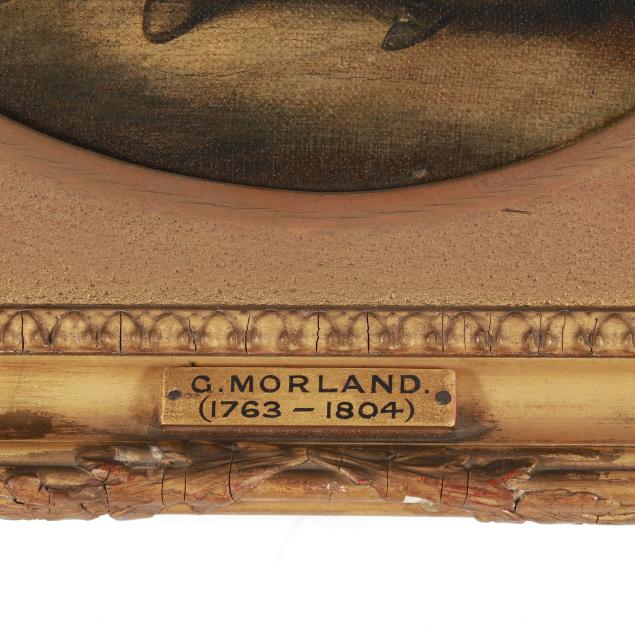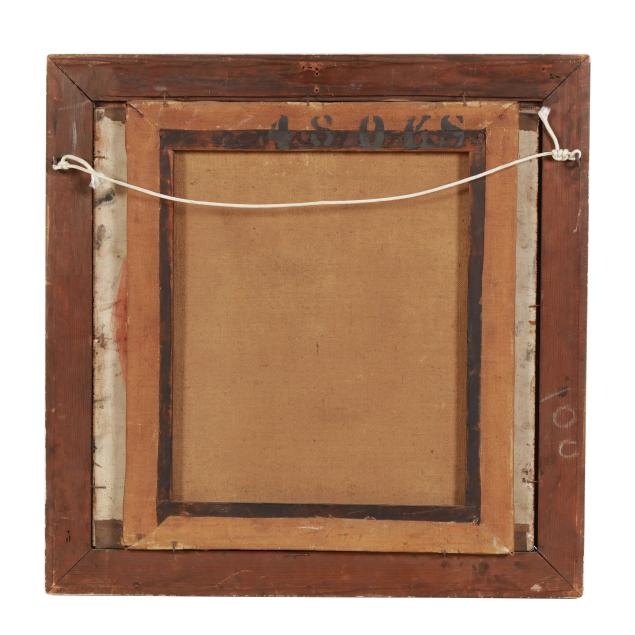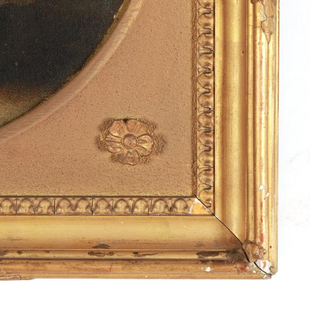 The painting has been lined, with yellowing to varnish, age cracking, and light retouching; the frame with minor losses.