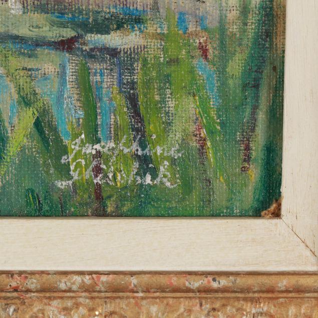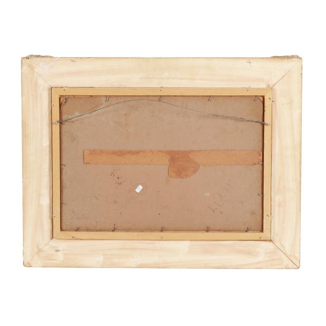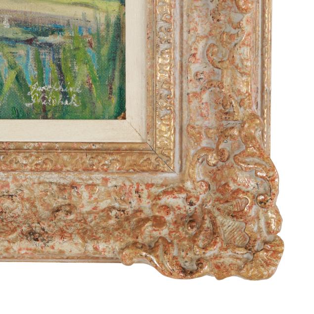 Oil on artist board, signed at lower right, presented in an ornate frame.