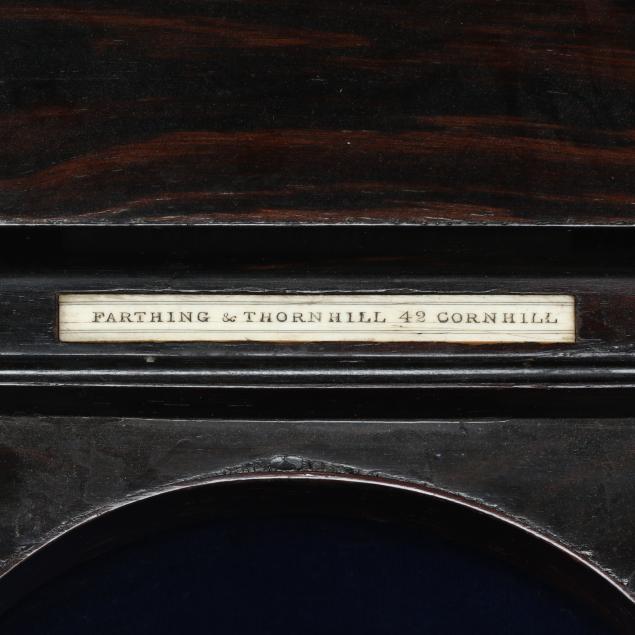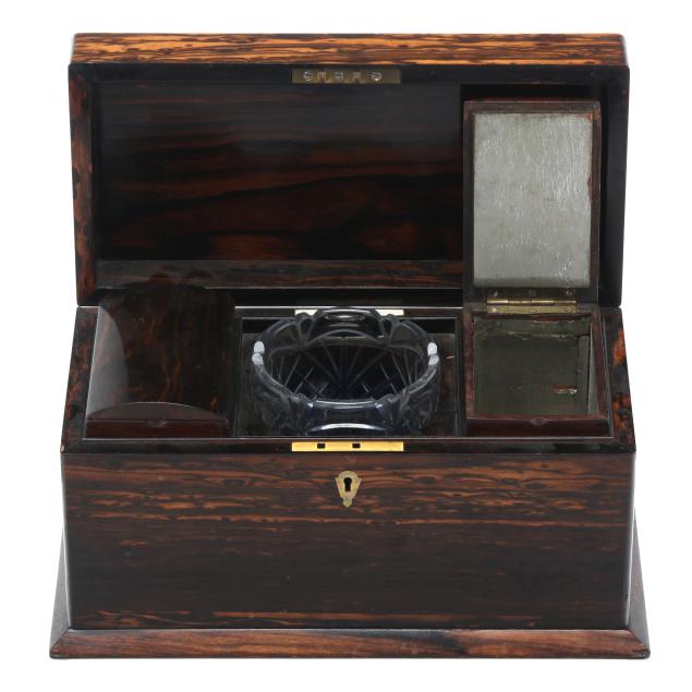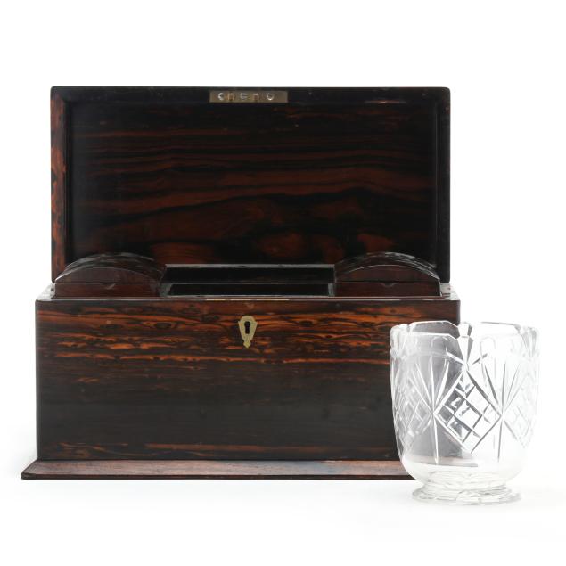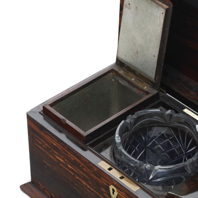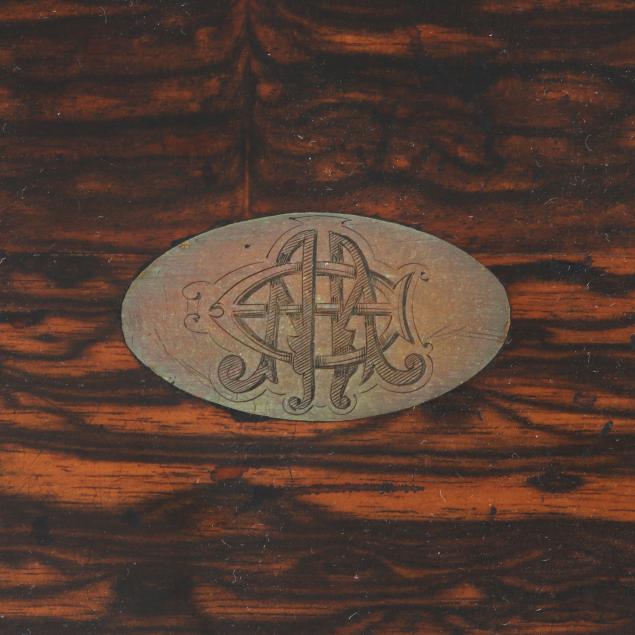 London, circa 1860, labeled "FARTHING & THORNHILL 42 CORNHILL" to the interior rim, of rectangular form with beveled base molding, inlaid brass key escutcheon, and lid with period intertwined monogram to the oval inlaid cartouche, opening to twin hinge-lidded tea compartments retaining much of the original tin lining, and central cut and footed mixing glass.
