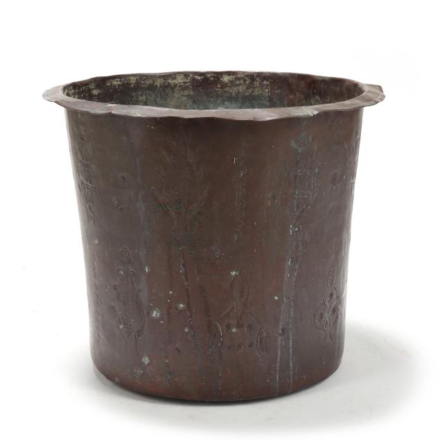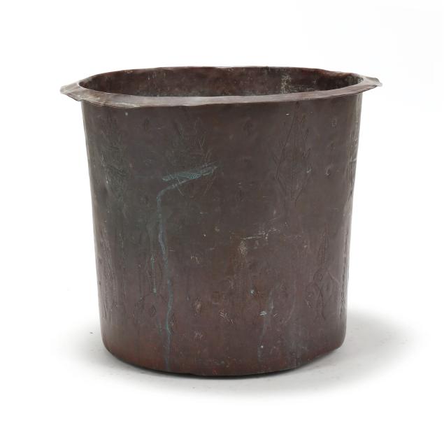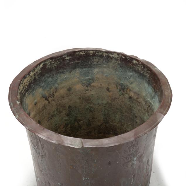 Some denting, mainly to rim and base; scattered areas of verdigris to exteriors and consistent oxidation to interior