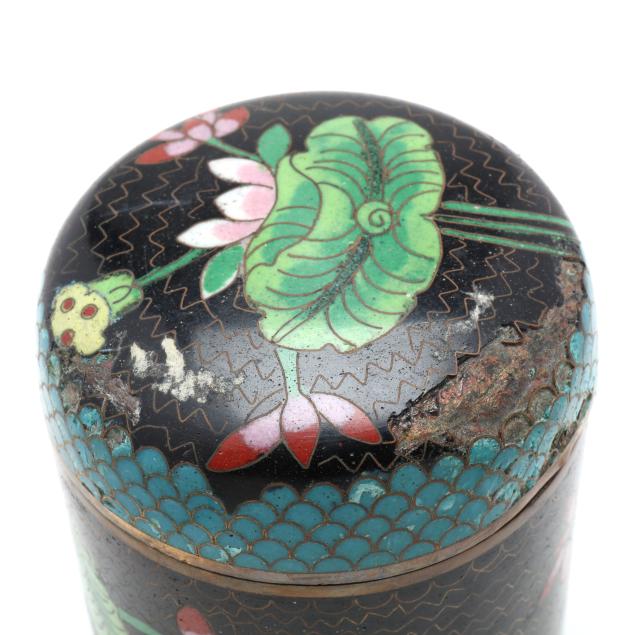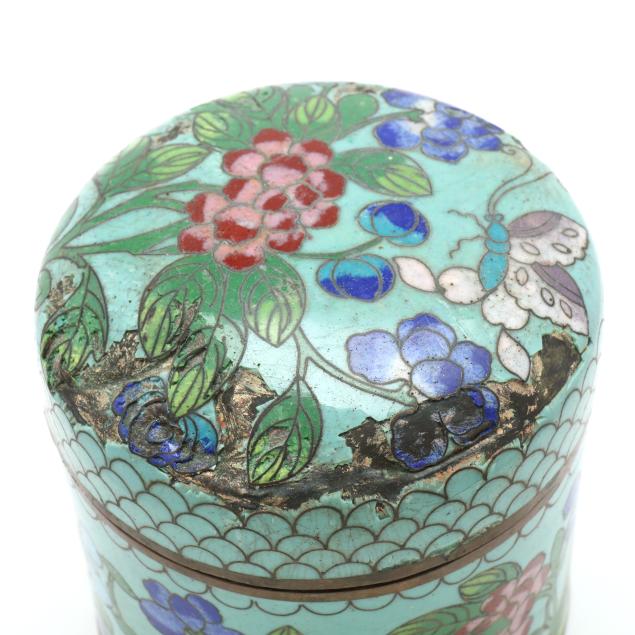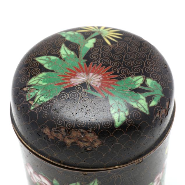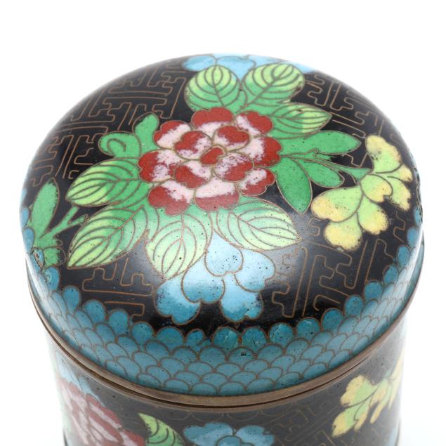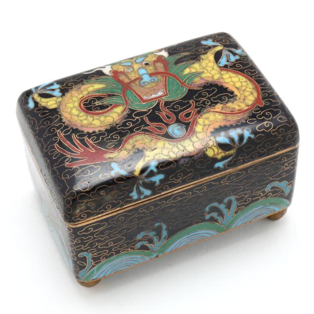 Early to mid 20th century, includes four cylindrical lidded boxes, one marked "CHINA" to underside, and two rectangular boxes with hinged lids on four ball feet, all decorated in the cloisonné technique using a range of colored enamels, the round boxes featuring floral decoration against a patterned ground, and one of the rectangular boxes with a frontal facing dragon to the cover.