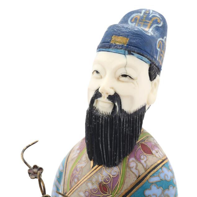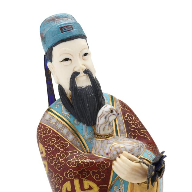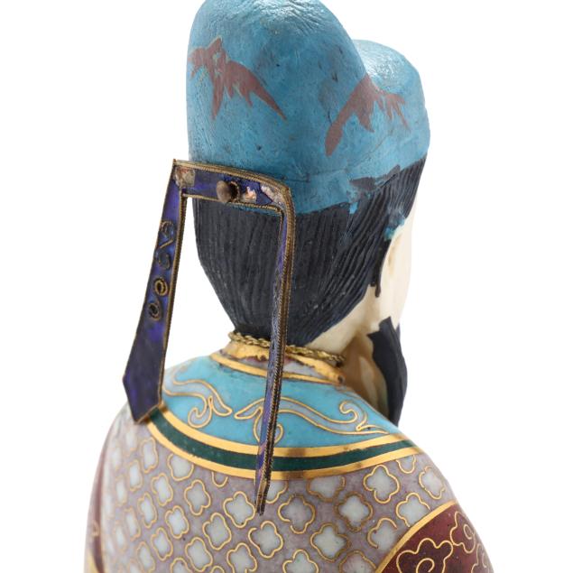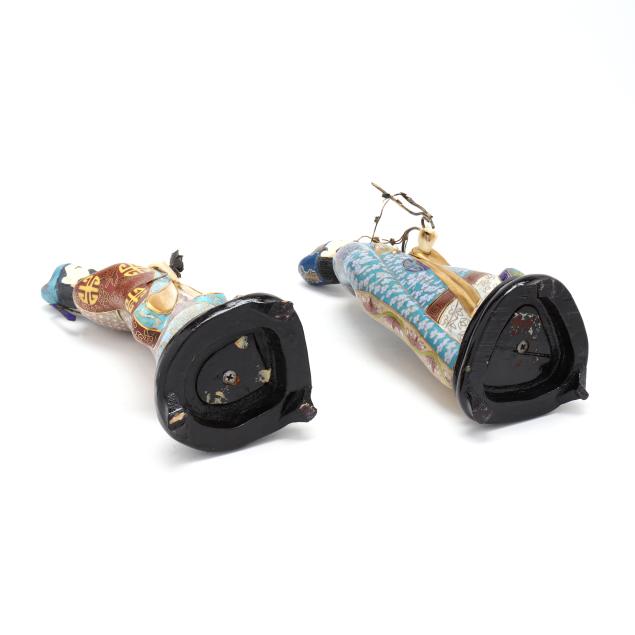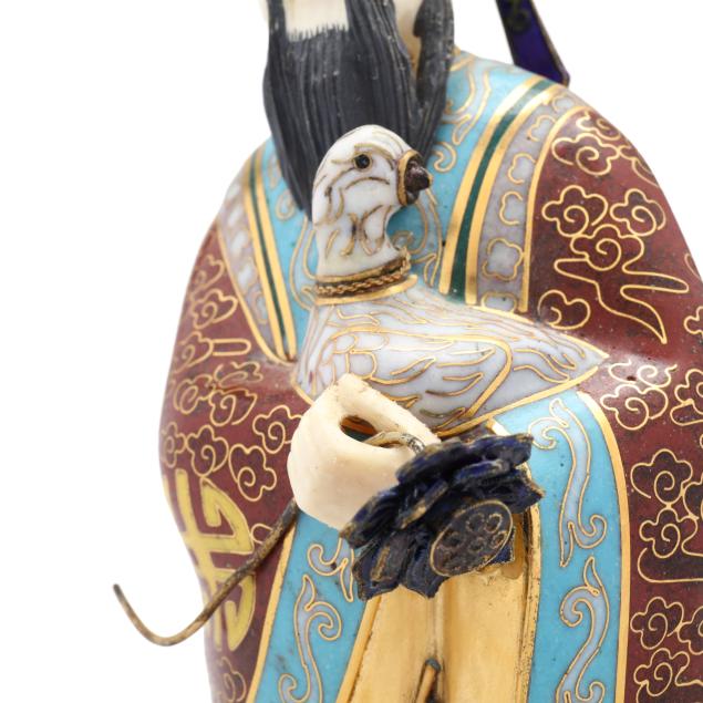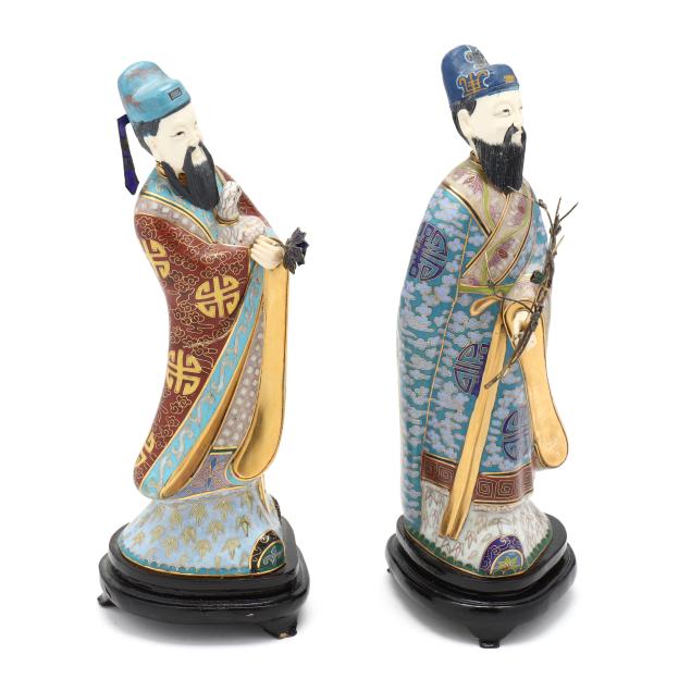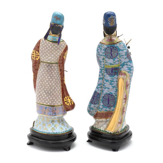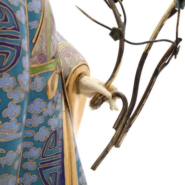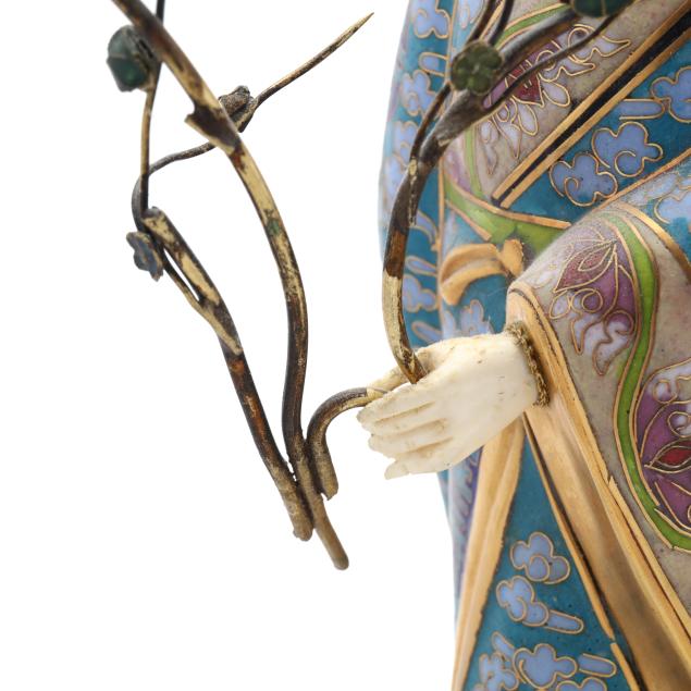 Early 20th century, each figure fashioned with long flowing robes of vivid enamels in the cloisonné technique, one figure is holding a metal branch with blossoms, the other a small bird, the hands and head of the stature are made of a different material and painted.