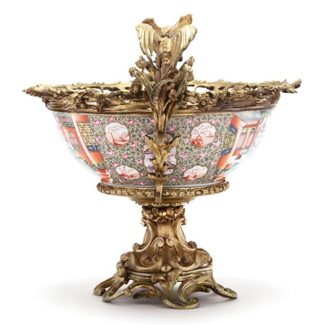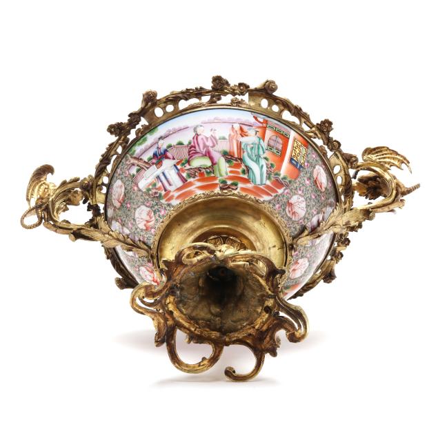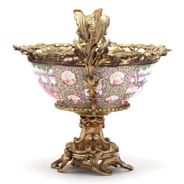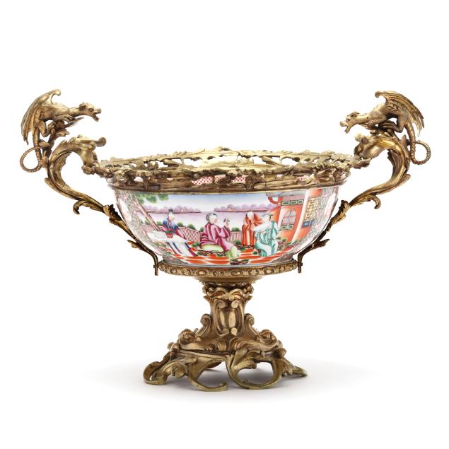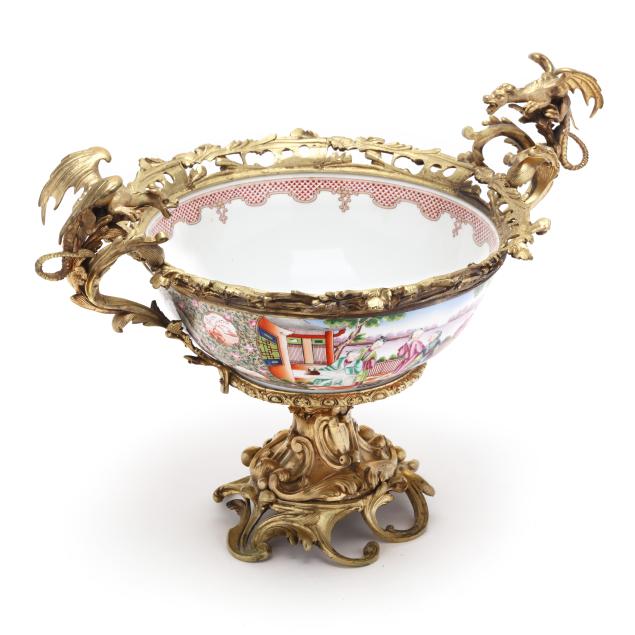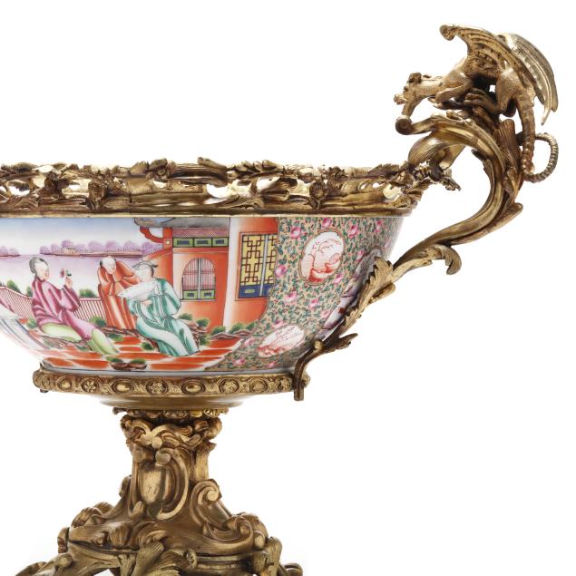 19th century, unsigned, with French cast dragon-form handles perched over a reticulated foliate rim elaborately cast pedestal base with c-scroll and rocaille strapwork, supporting a large round Chinese Rose Mandarin footed centerpiece bowl, well-painted with various garden settings and Chinese figures, bordered by floral vignettes beneath a scaled and scroll rim border.