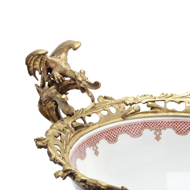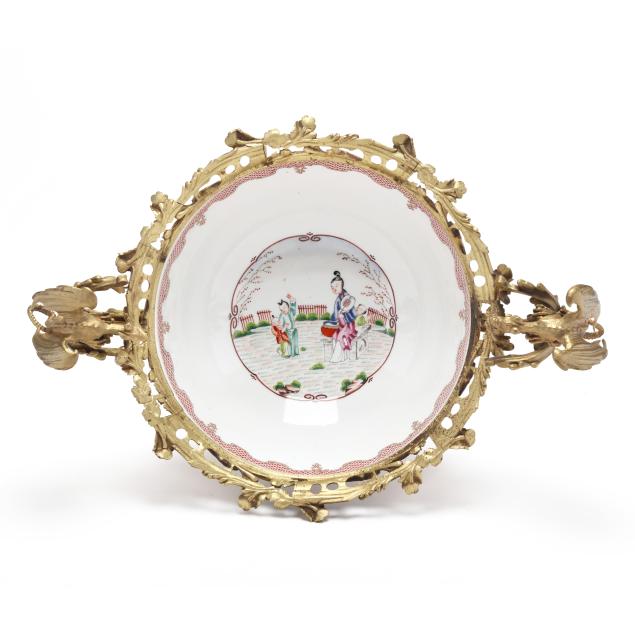 From the Collection of Kayvon North, Raleigh, North Carolina Interior bowl may be later decoration; some hairlines to ormolu along the rim; gilt rubbing and spotting to ormolu.