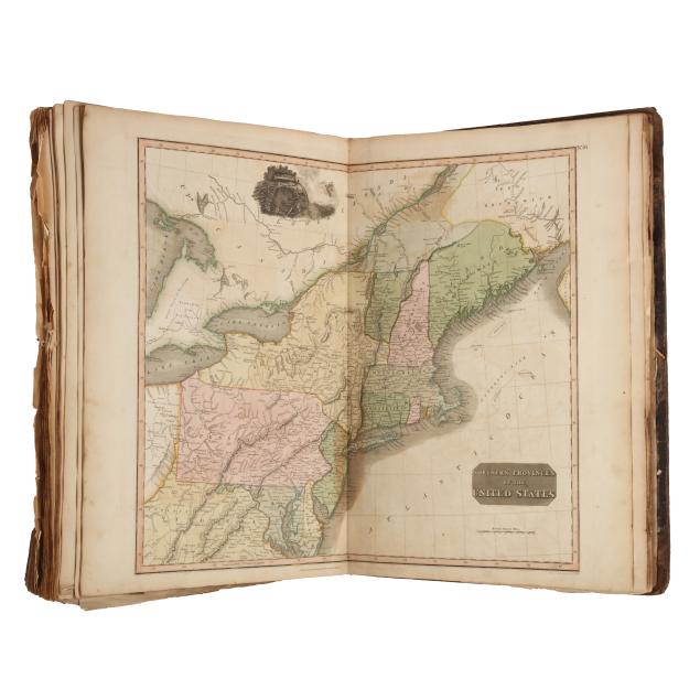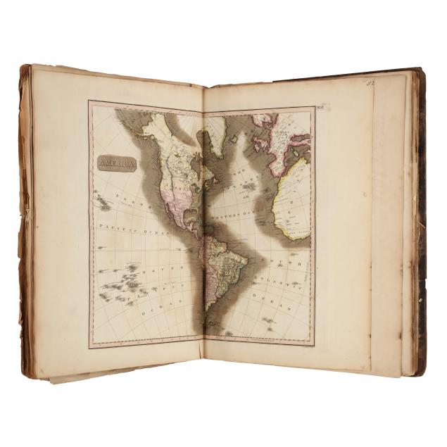 Being sold as a collection of maps (binding extremely worn with boards detached but present, and endpapers, several leaves including title, and some maps detached); lacking two maps ("Germany, north of the Mayne" and "The Kingdom of Poland, as divided"); ownership information in pencil on free endpaper; with various signs and degrees of wear throughout such as offsetting, foxing, toning, damp staining, chips and tears, separation at centerfold, soiling, trimming, and a few repairs; most maps numbered (with printed number, small pasted label, or hand-numbering). Please contact the specialist for a detailed condition report of individual maps.