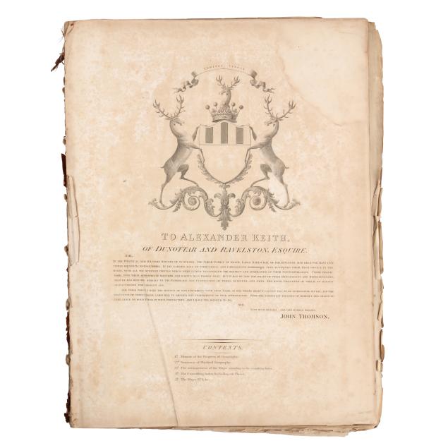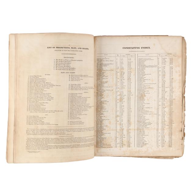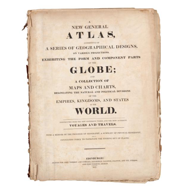 Constructed from the Best Systemic Works, and the Most Authentic Voyages and Travels. With a Memoir of the Progress of Geography, a Summary of Physical Geography, and a Consulting Index to Facilitate the Finding Out of Places. Edinburgh: Printed for John Thomson and Company; London: Baldwin, Cradock, and Joy; Dublin: John Cumming, 1817. Large folio; with title page, dedication, xxiii (with tables), [1 list of projections, maps, charts], 22pp. (index), a double-page "A Comparative View of the Heights of the Principal Mountains and other Elevations," and (72) of the (74) double-page engraved maps. Maps with hand-coloring or colored outlines. Phillips 731.