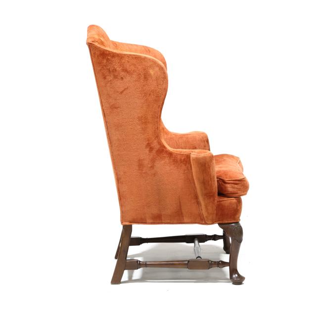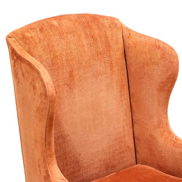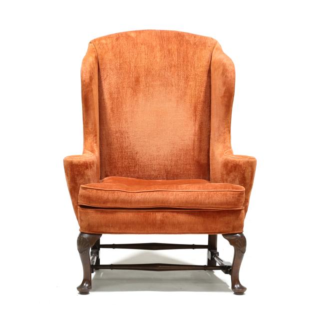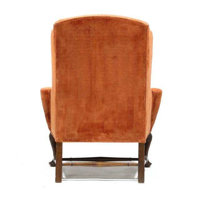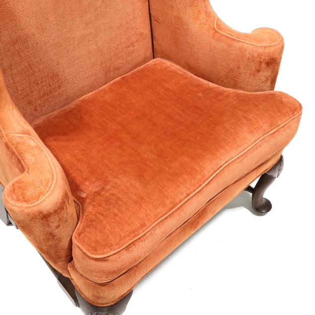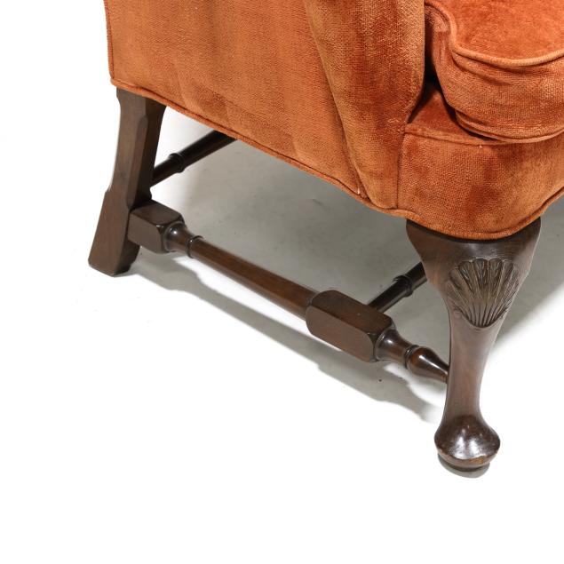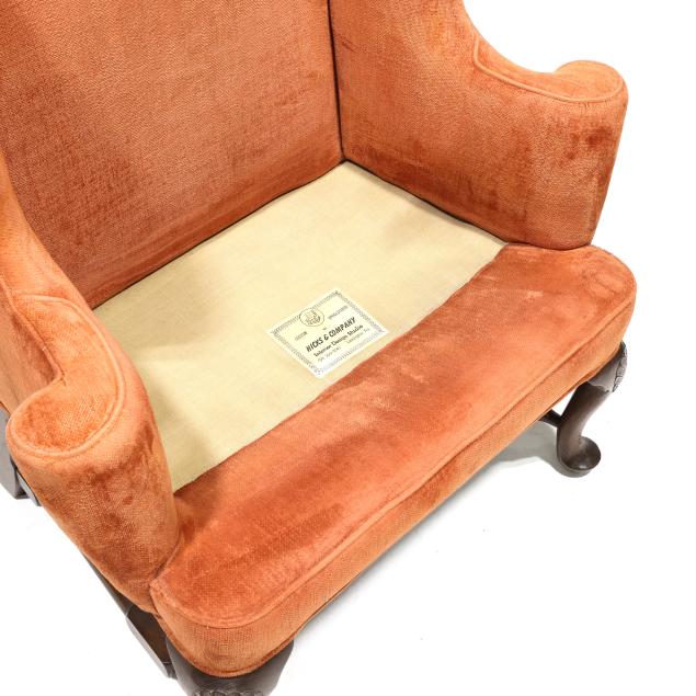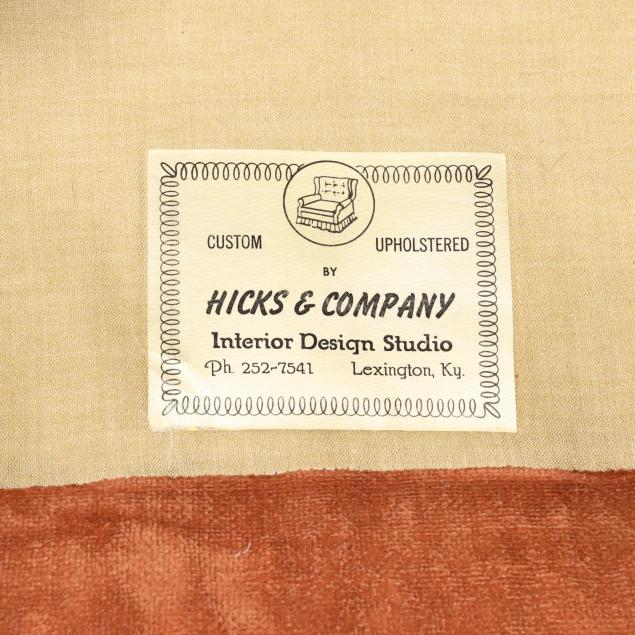 Mid-20th century, salmon plush upholstery with loose seat cushion and labeled Hicks & Company, cabriole legs with relief carved feathered fan knee, turned stretcher base.
