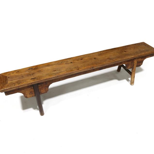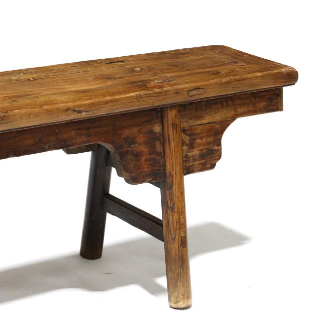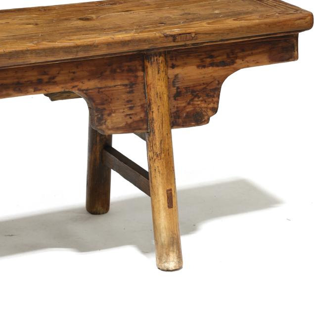 Late 19th / early 20th century, rectangular top with banded edge, through tenon joinery, arched return panels, splayed rounded legs with stretcher joints.