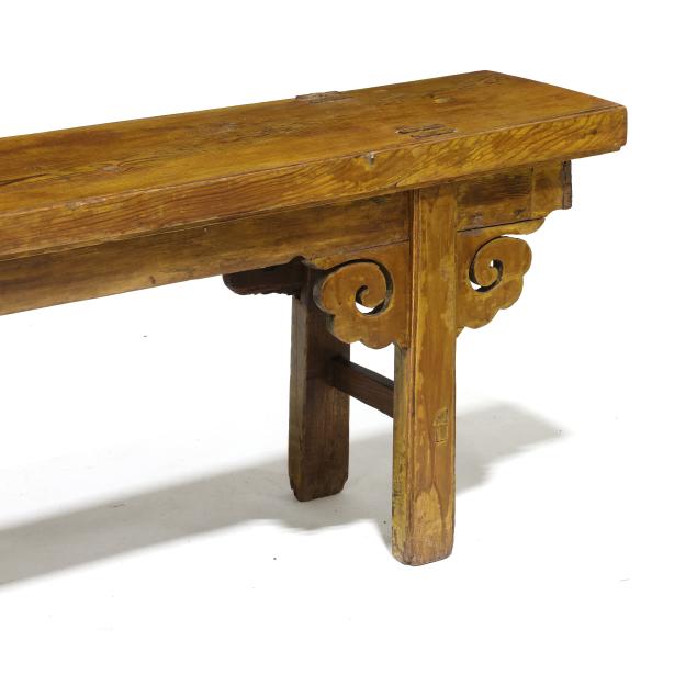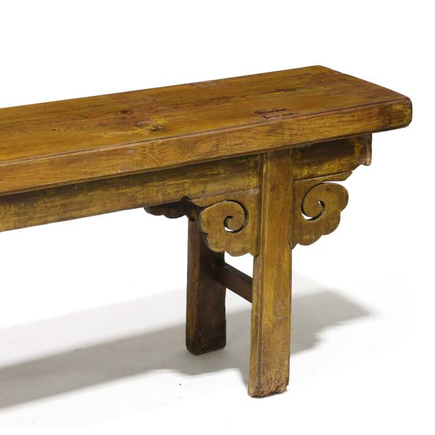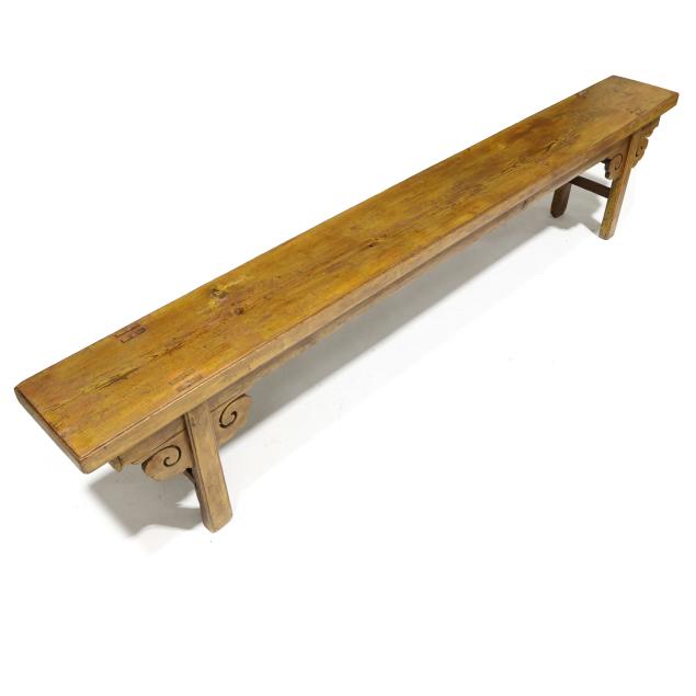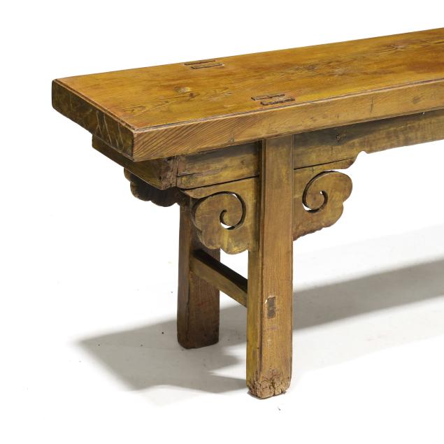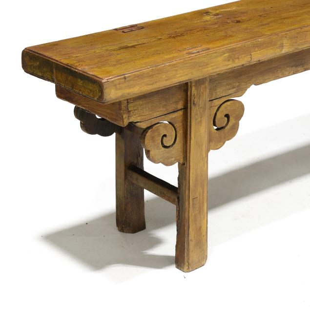 Late 19th / early 20th century, single board top with molded edge and through tenon joinery, scrolled returns, straight legs with molded edge and stretcher joints.
