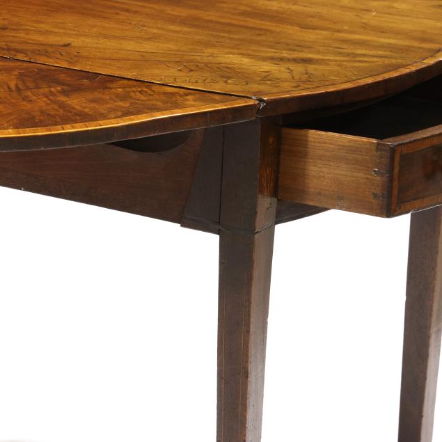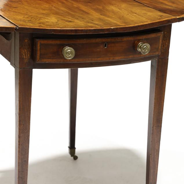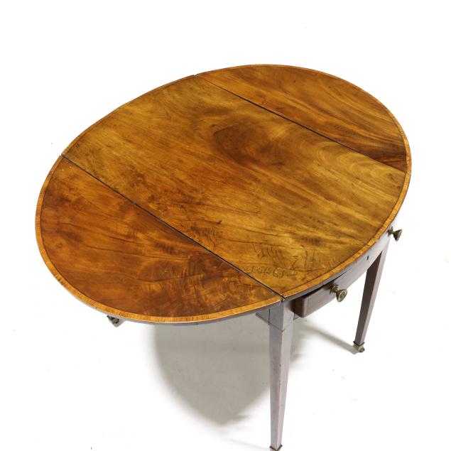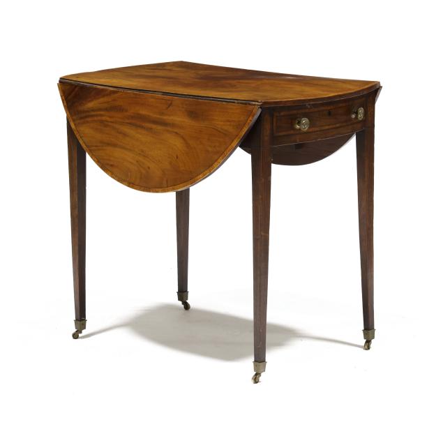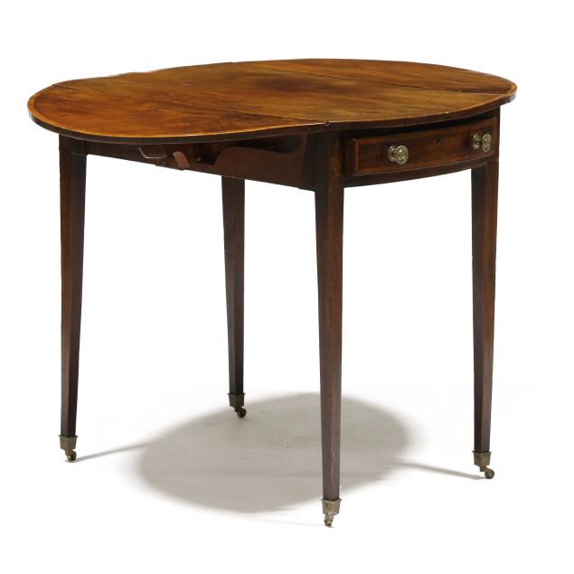 Circa 1800, mahogany, mahogany veneer, light and dark wood inlays, deal secondary, rectangular top with rounded ends, D-shaped drop leaves with single butterfly support, single drawer with banded inlays, verso with faux drawer, straight tapered legs surmounted by thistle inlay, brass feet and casters.