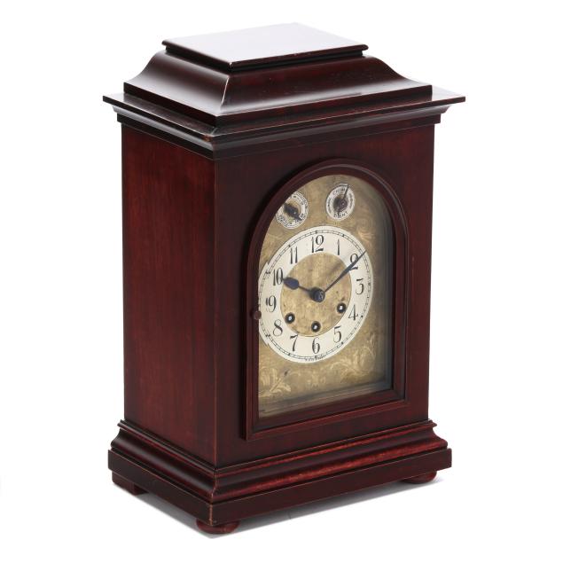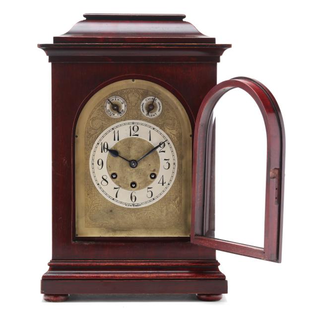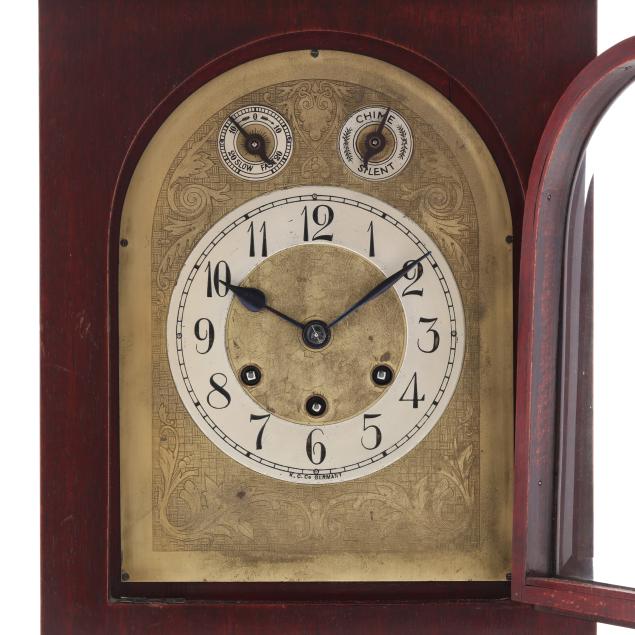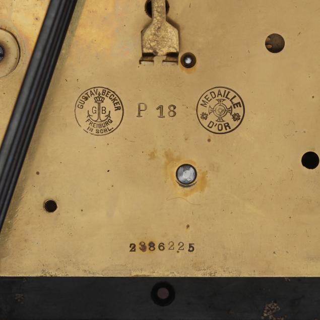 Germany, early 20th century, engraved brass face with 5-inch round steel dial featuring Arabic chapters, signed "K. C. Co. GERMANY" possibly for the retailer Kuehl Clock Company of Chicago and Germany, and subsidiary upper dials, operated by a three train brass works fitted with 8 hammers striking on five gongs on the quarters, signed with Medallion stamps of "GUSTAV BECKER / FREIBURG IN SOHL" and "MEDAILLE / D'OR," numbered "P18" and "2386225."