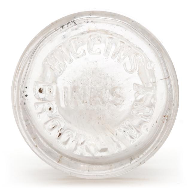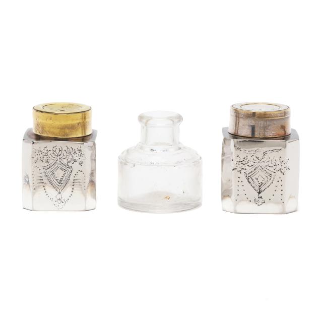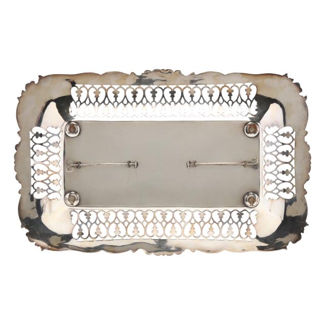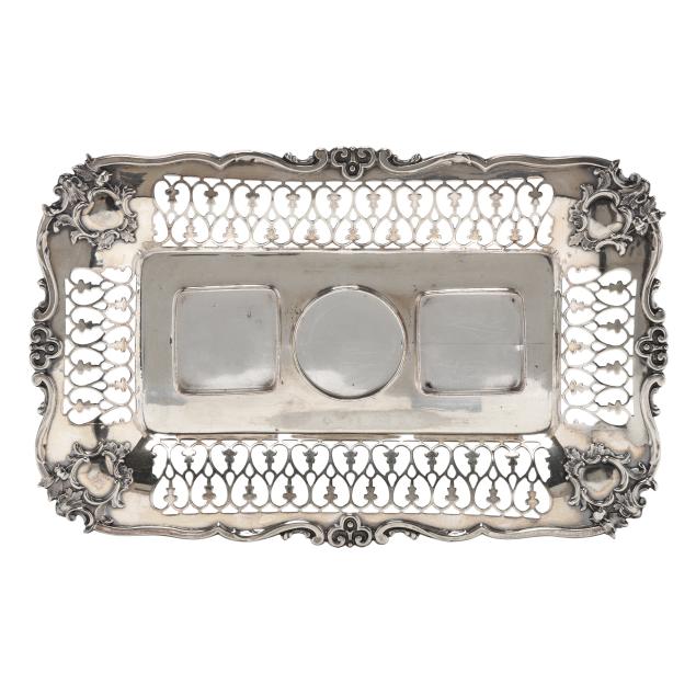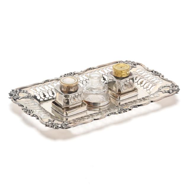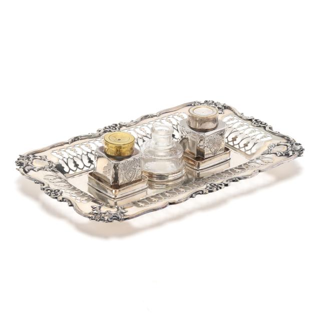First half 20th century, rectangular form tray with reticulated and shaped rim, mounted with two lidded inkwells, all unmarked, flanking a central vintage 3/4 oz glass ink bottle marked "HIGGINS INKS BROOKLYN NY" to the underside.