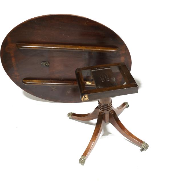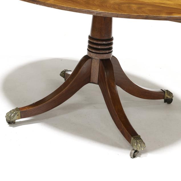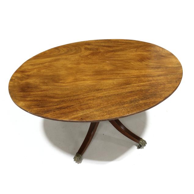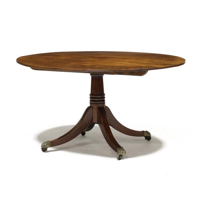 Early 19th century, oval top with reeded edge, block and batten support, turned standard, quadruped base with brass paw feet on casters.