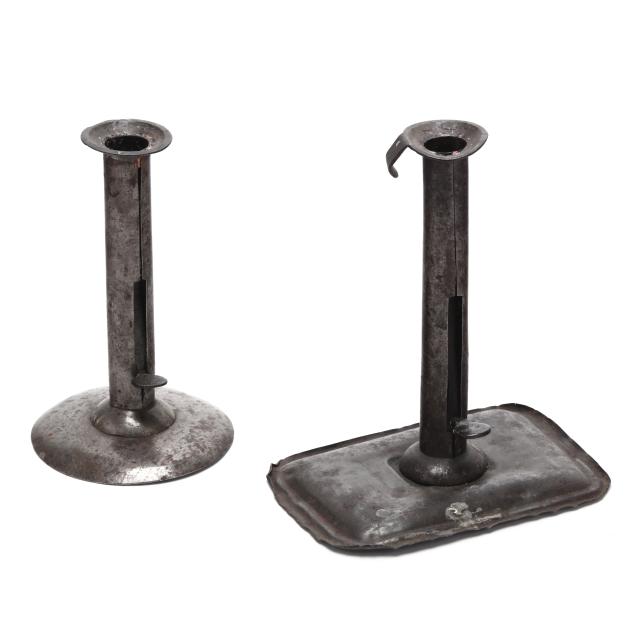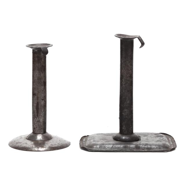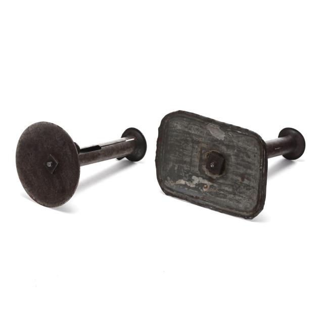 19th century, metal push up form, the taller with rectangular slightly domed base, worn monogram signature to the push up tab (7 in.); the second with round slightly domed base, unmarked (6 1/4 in.).